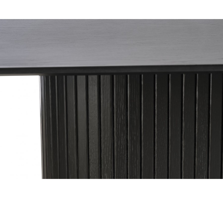 Stôl je vyhotovený z kombinácie MDF a kvalitnej dubovej dyhy. Povrchová úprava v čiernej farbe podčiarkuje jeho moderný vzhľad, pričom priznaná kresba dreva dodáva celku prírodný prvok.