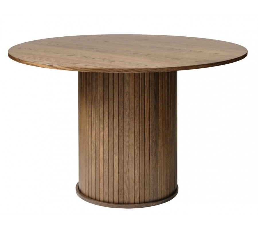 Retro tmavý hnedý dubový jedálenský stôl Bornholm s hladkou okrúhlou doskou a nohou s lamelovým dekorom 120 cm