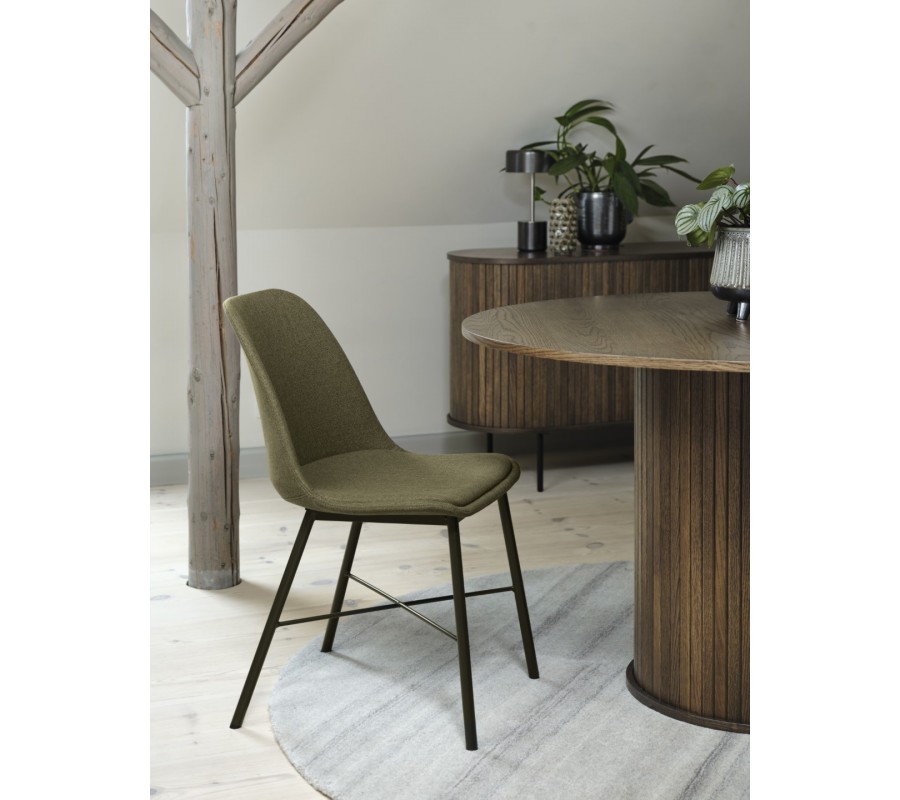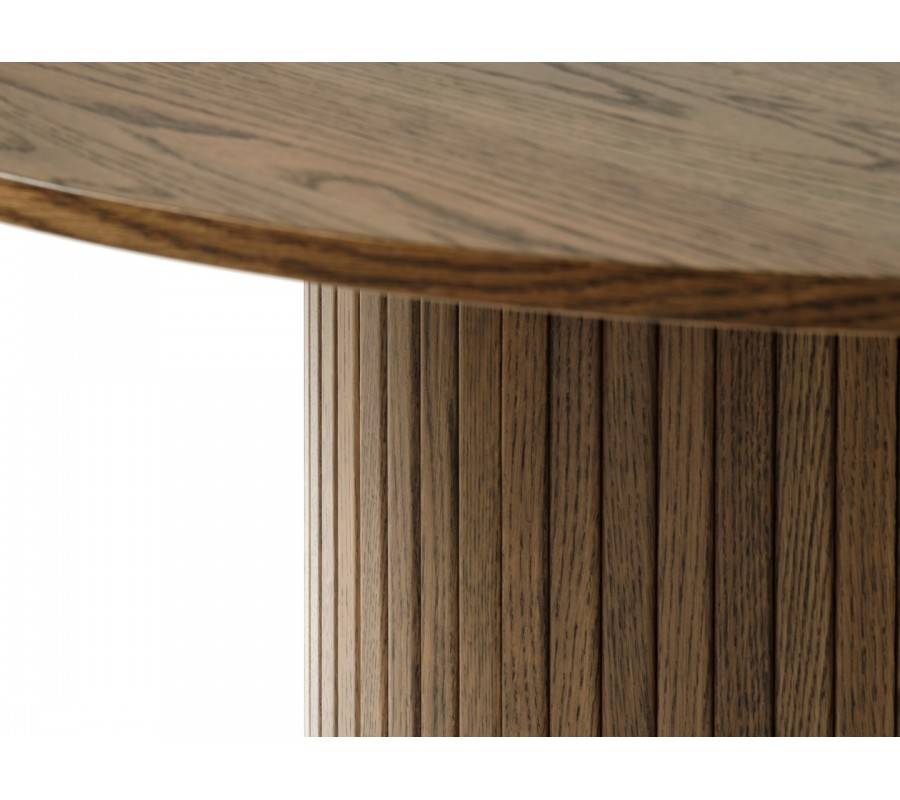 Stôl je vyrobený z pravej dubovej dyhy v kombinácii s MDF. Tmavohnedý odtieň zvýrazňuje prirodzenú kresbu dreva a podčiarkuje jeho autentický prírodný vzhľad, pričom dodáva nábytku typický severský vizuál.