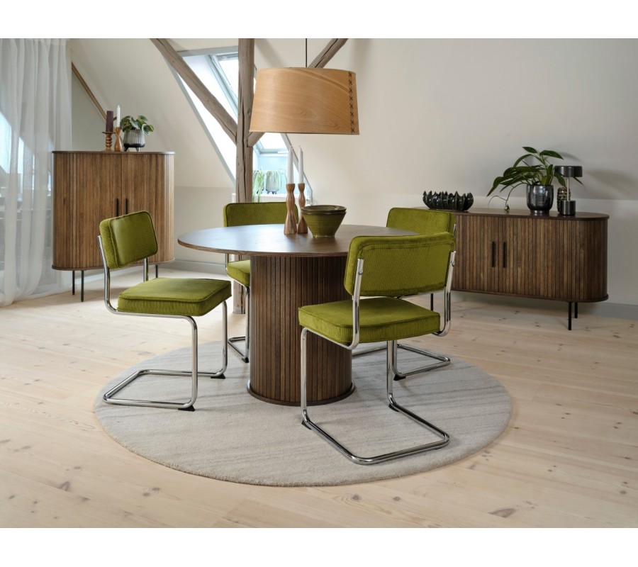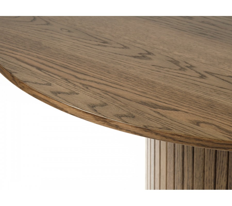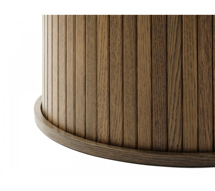 Dizajn stola sa nesie v duchu plynulých zaoblení a vyvážených tvarov, ktoré vytvárajú minimalistickú nadčasovú siluetu. Dominantným prvkom je robustná valcovitá noha, doplnená v spodnej časti o pevný okrúhly základový rám pre vyššiu stabilitu. Jej povrch zdobí vertikálne lamelovanie, ktoré dodáva celku jemný retro akcent. Hladká okrúhla doska s tenkým profilom vytvára kontrast k mohutnej podstave a pôsobí vizuálne ľahko.