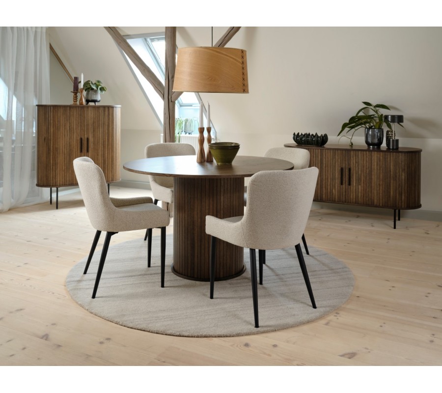Jedálenský stôl Bornholm predstavuje vkusné prepojenie čistého škandinávskeho dizajnu a elegantných retro detailov. Prevedenie v tmavej hnedej farbe pôsobí sofistikovane a záveň dodá priestoru typický severský charakter. Okrúhla doska s priemerom 120 cm ponúka pohodlné stolovanie pre štyri až päť osôb.