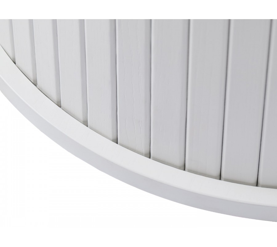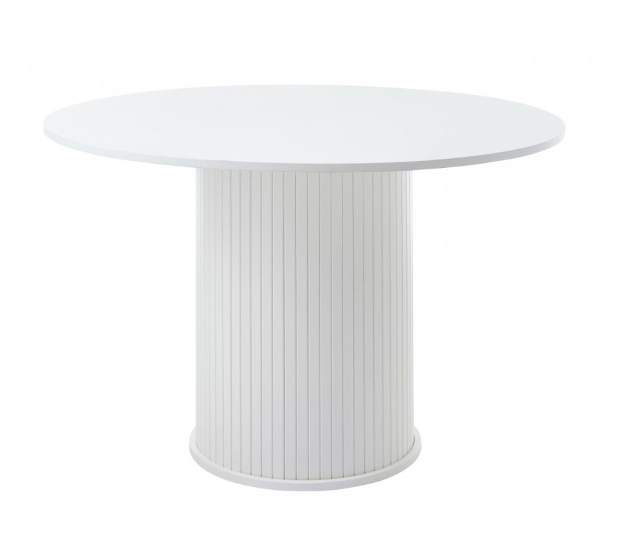 Moderný okrúhly jedálenský stôl Bornholm s valcovitou nohou s lamelovým dekorom a hladkou doskou v bielej farbe 120 cm