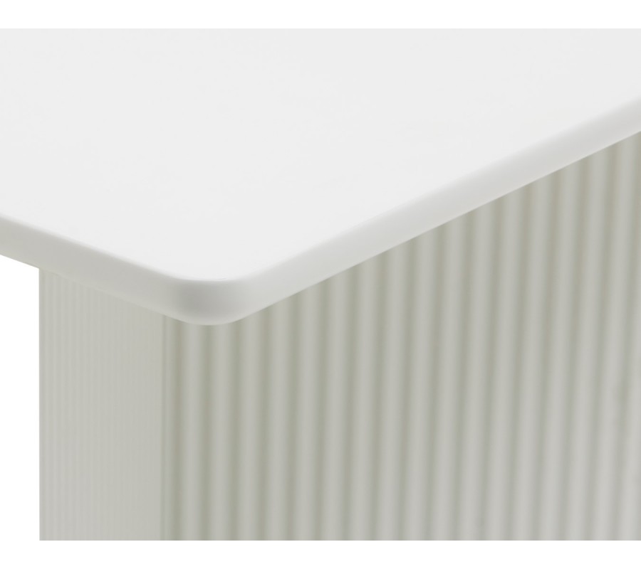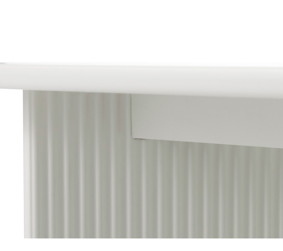 Stôl má hladkú obdĺžnikovú vrchnú dosku so zaoblenými rohmi. S rozmerom 200x90 cm poskytne miesto pre šesť osôb, pričom dizajn podstavy umožňuje pohodlné sedenie pri dlhších stranách a aj za vrcholmi stola. Dve nohy majú pôdorys v tvare písmena V a sú orientované vrcholmi k sebe. Zdobí ich vertikálne rebrovanie, inšpirované art deco štýlom.