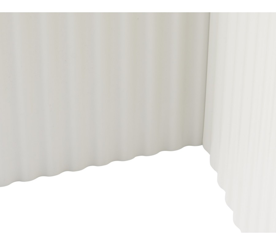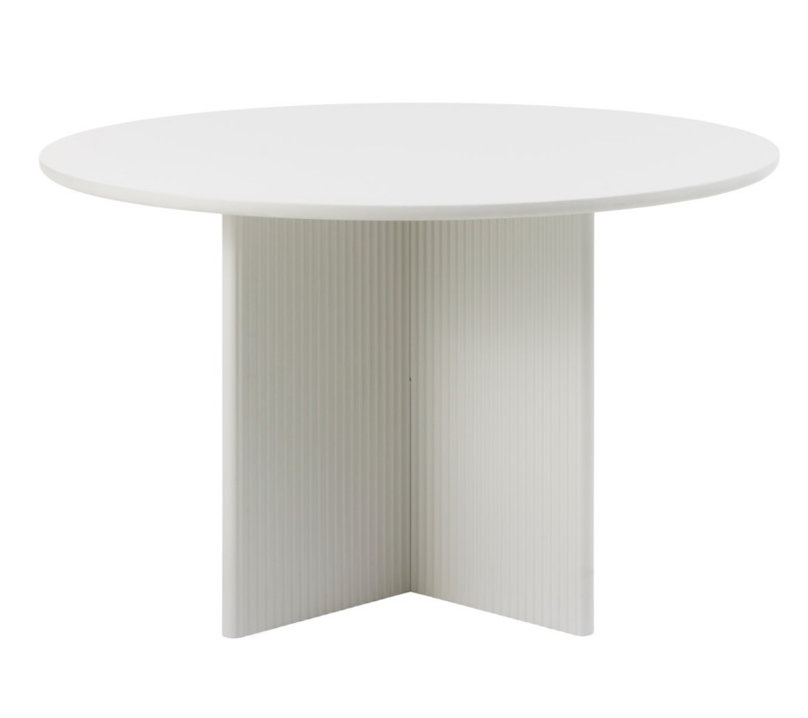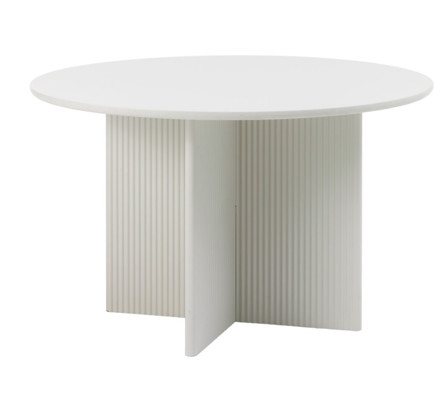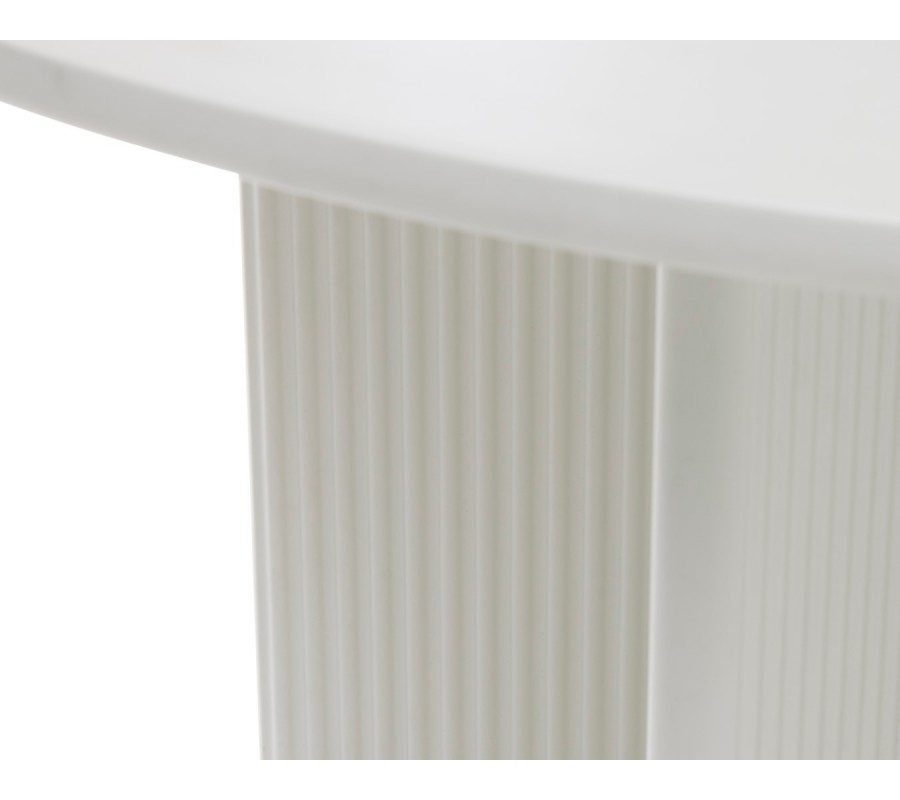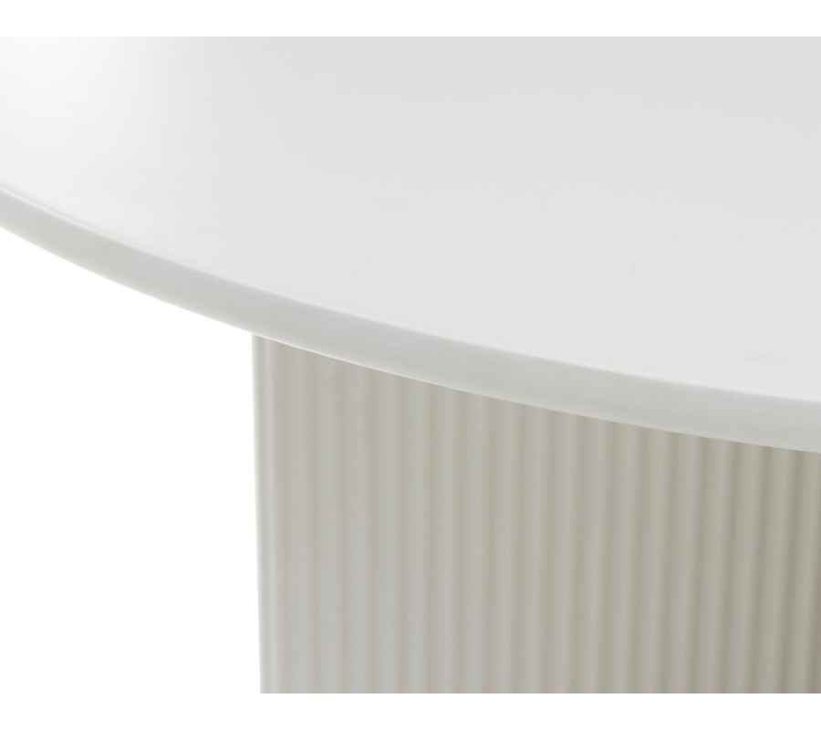 Stôl má okrúhlu hladkú vrchnú dosku, ktorá s priemerom 110 cm poskytne stolovacie miesto pre štyri osoby. Dopĺňa ho dizajnová podstava so štyrmi plnými nohami, symetricky umiestnenými do kompozície v tvare X. Každú nohu zdobí vertikálny rebrovaný reliéf, ktorý dodáva nábytku dekoratívny prvok v art deco štýle a zároveň výborne korešponduje s modernými minimalistickými geometrickými tvarmi.