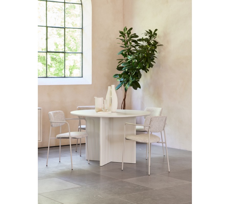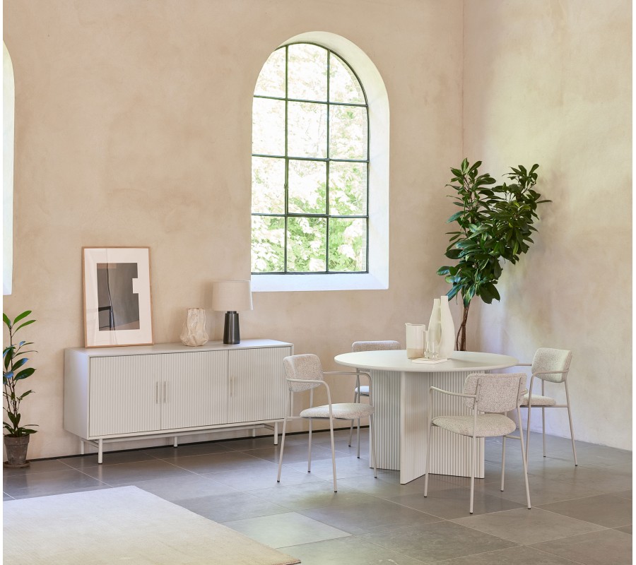 Jedálenský stôl Hvidea je skvelou voľbou do moderných interiérov zariadených v zemitých farbách, kde prinesie zaujímavú štruktúru a zároveň v kombinácii so svetlými prírodnými materiálmi, ako napríklad drevo či kameň, vytvorí elegantný minimalistický vizuál. V art deco jedálňach ho zasa môžete doplniť farebnými zamatovými stoličkami či lesklými zlatými doplnkami. Priestor výborne doladia aj ďalšie modely z rovnakej kolekcie Hvidea.