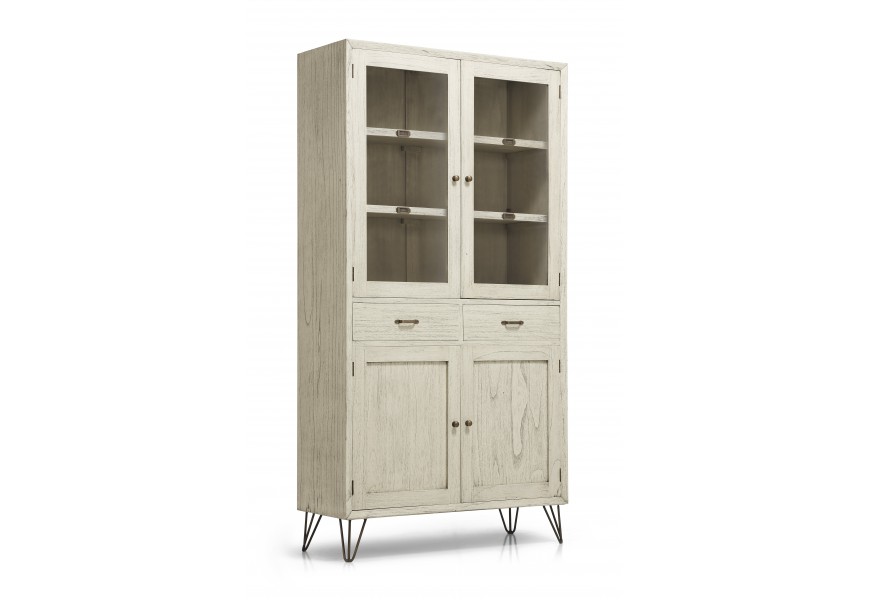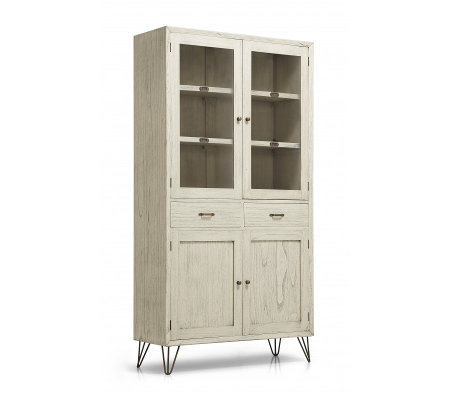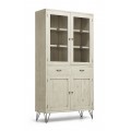 Biela vitrína MURIA v retro štýle z dreva mindi s dvomi zásuvkami a presklenými dverami