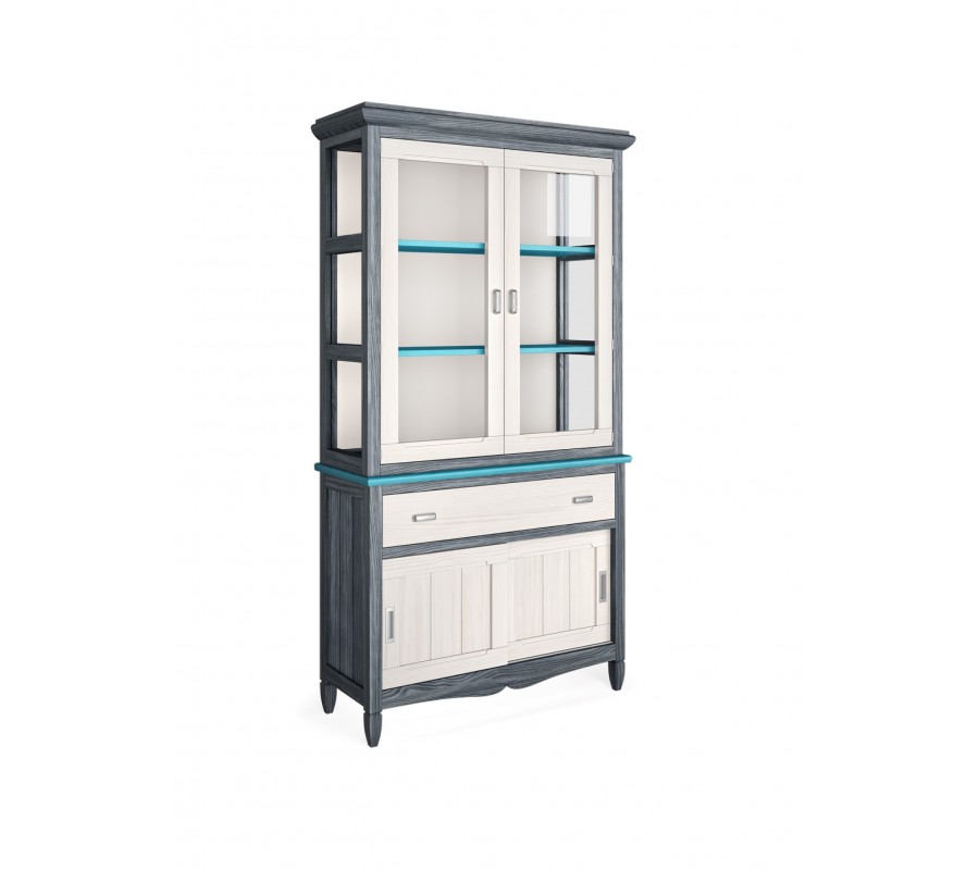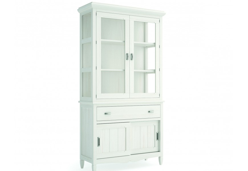 Elegantná masívna vitrína Amberes so sklenenými dvierkami, zásuvkami a posuvnými dvierkami 210cm