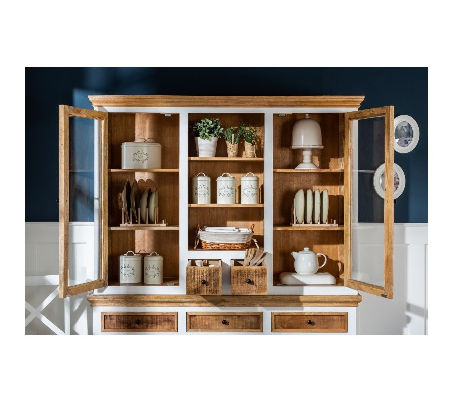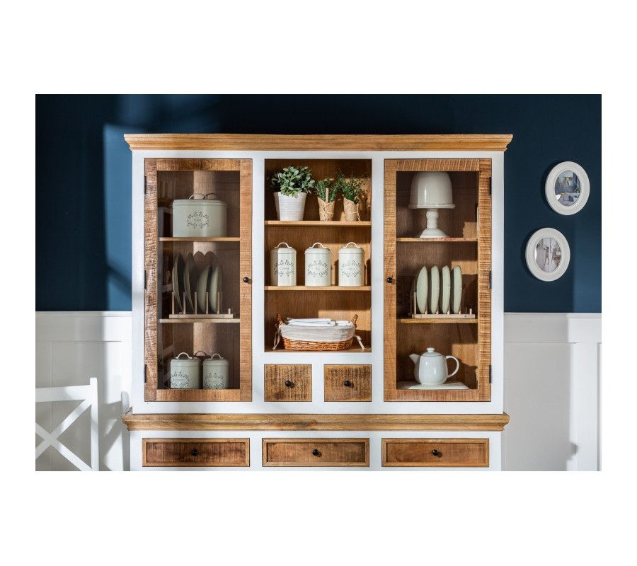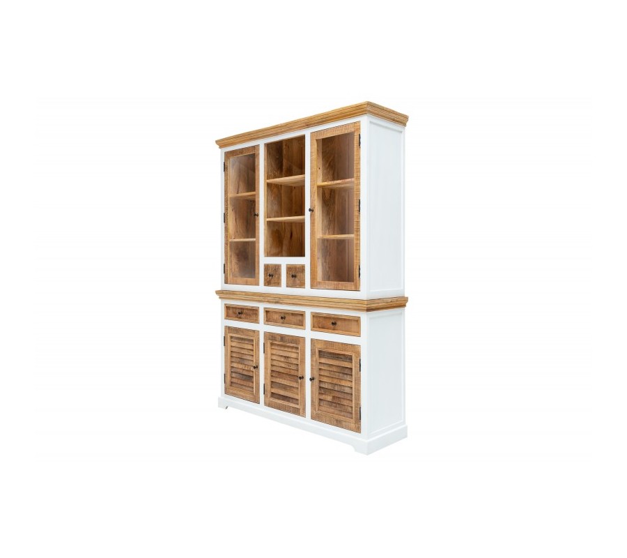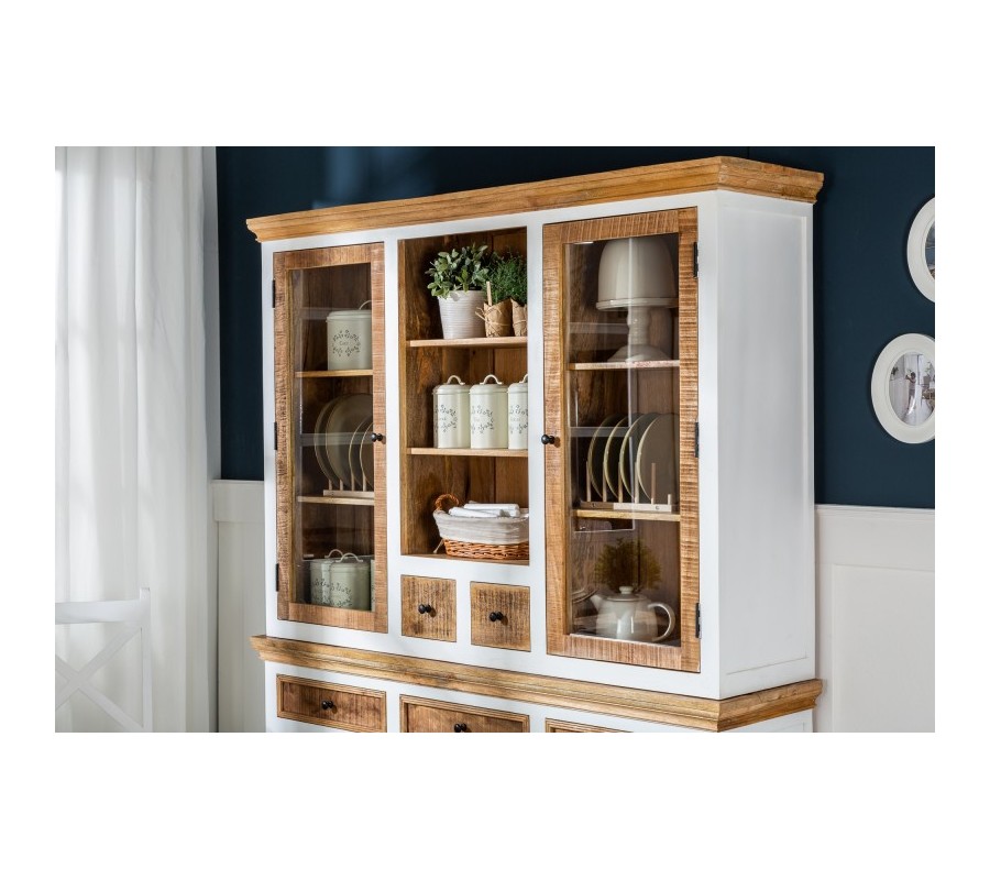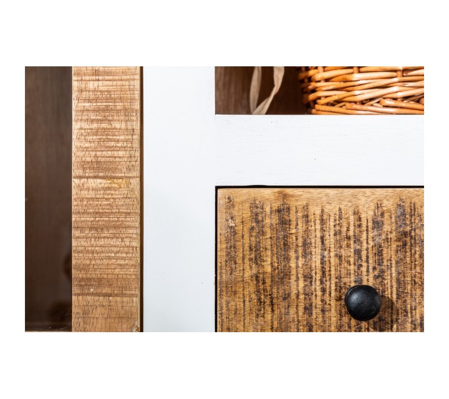 Luxusná a nadčasová vitrína Frida Blanca v nádhernom vidieckom štýle je príkladným predstaviteľom svojho štýlu a zlučuje v sebe krásu a prirodzenosť mangového masívneho dreva vo svojej naturálnej farbe s nádhernou kresbou s čistotou a jemnosťou bielej farby. Vitrína Frida vám poskytuje dostatok úložného priestoru v podobe deviatich priestranných políc a dvoch zásuviek, pričom niektoré z políc sú za presklenými dvierkami s vkusnými minimalistickými rukoväťami. Masívnu vitrínu odporúčame kombinovať najmä s kúskami v zemitej farebnosti v tlmených odtieňoch vyrobených z prírodnín. Vitrína Frida dokonale ozvláštni a oživí vašu jedáleň či pracovňu.