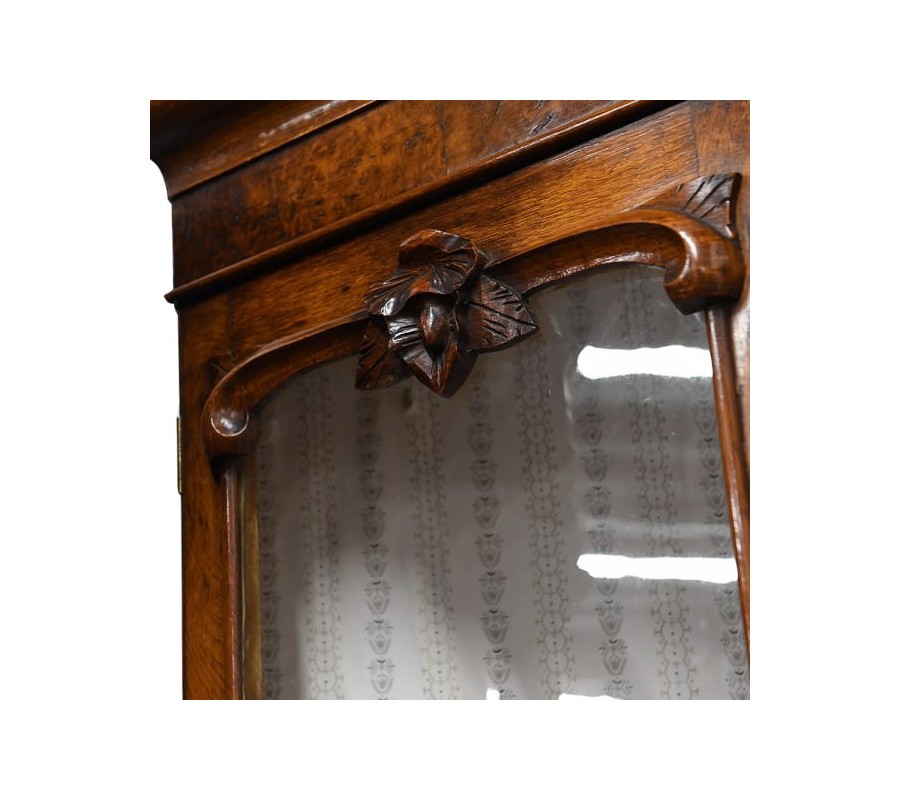 Rohová vitrína Adalia predstavuje unikátny kúsok vhodný na zariadenie klasickej, vintage či rustikálnej obývačky, kuchyne alebo jedálne. Nesie vo výraznej tmavohnedej farbe, ktorá vo vašich priestoroch vyčarí príjemný naturálny nádych. Tento efekt vyzdvihuje najmä krásne viditeľná kresba dreva na povrchu navnadzujúca prírodný vintage štýl. Rohová vitrína je ideálnym kúskom pre všetkým, ktorí chcú naplno využiť svoje priestory. Poskytuje úložný priestor v podobe troch poličiek chránených sklenenými dvierkami a v spodnej časti poličiek s plnými dvierkami. ožičky aj vrchnú časť vitríny zdobí nádherné precízne ručne vyrezávané zdobenie. Zaujímavé je tiež samotné vnútro vitríne, keďže poličky sú zdobené jemným vzorom na kontrastnom bielom podklade. Luxusná rohová vitrína Adalia vkusne doplní priestory zariadené ďalšími masívnymi kúskami, stoličkami či kreslami so svetlým, jemným čalúnením a kontrastnými bielymi či smotanovými doplnkami.