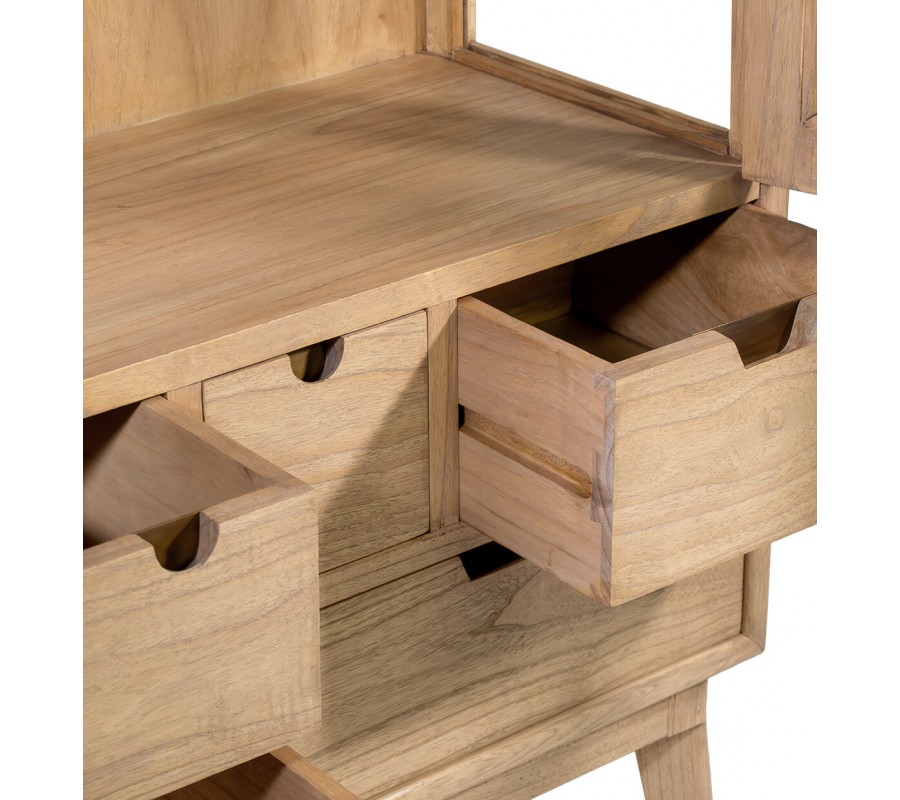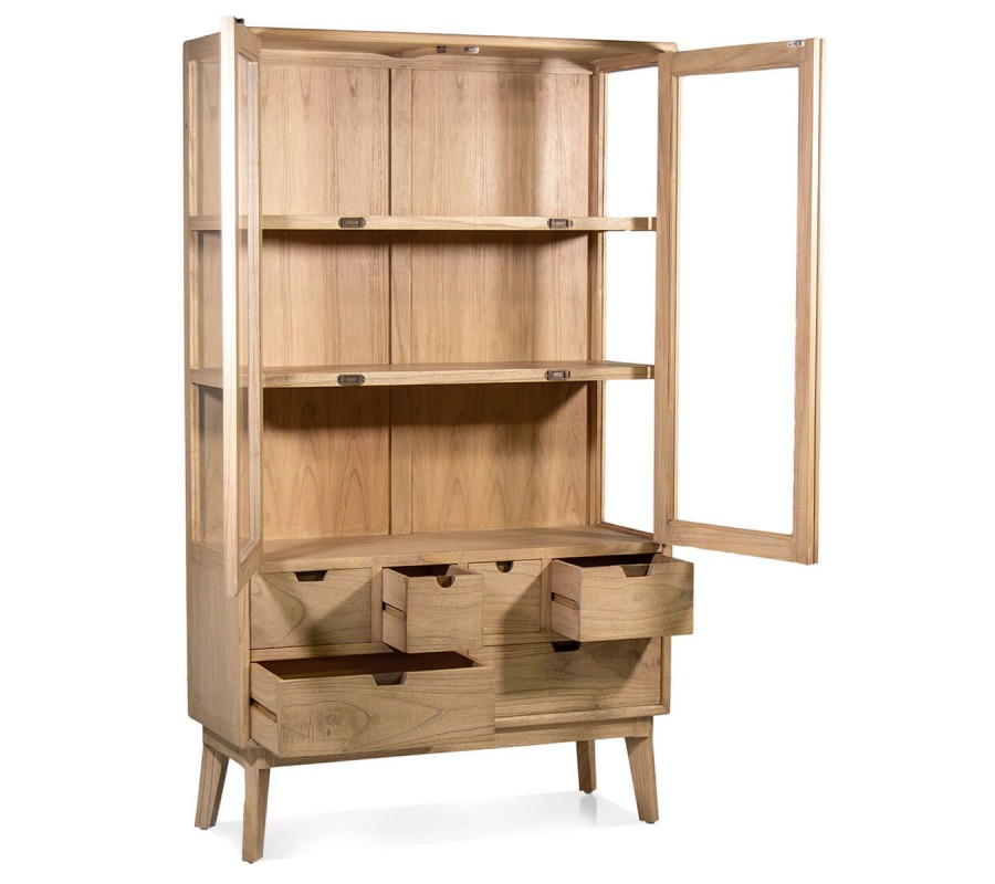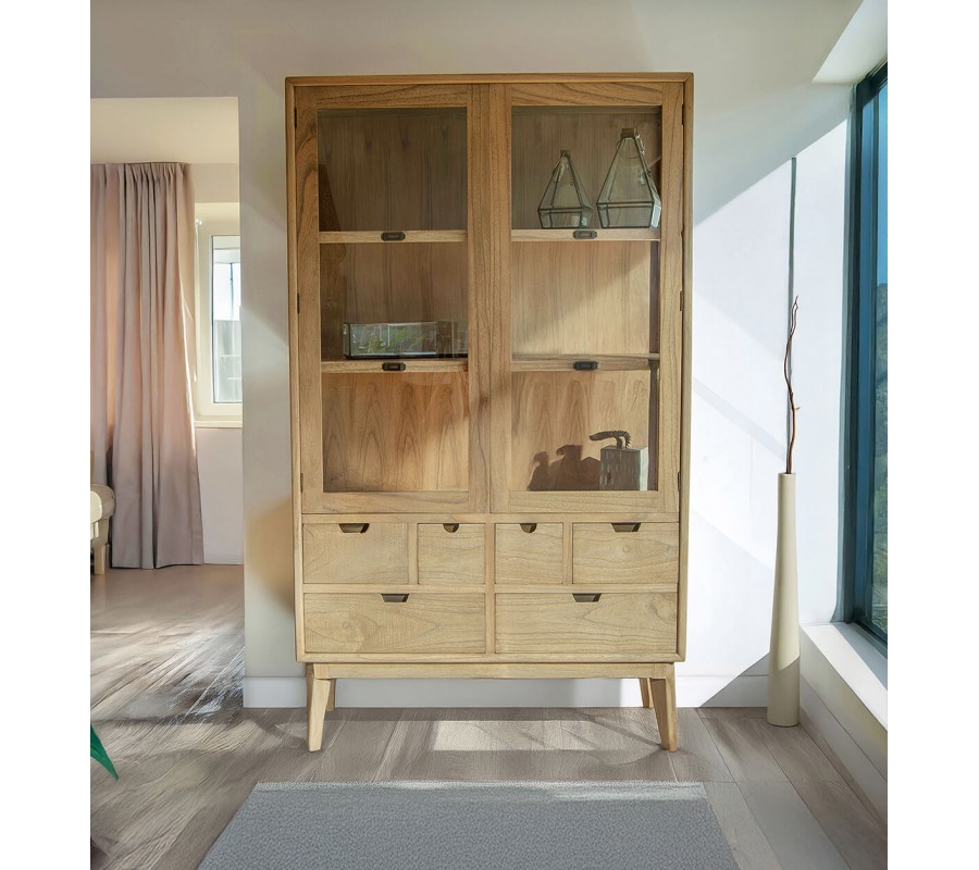 Škandinávska vitrína Bergen v severskom štýle prináša kombináciu minimalizmu, funkčnosti a prírodných materiálov. Vyrobená je z masívneho dreva mindi, známeho svojou pevnosťou a jemnou kresbou, dodáva interiéru svetlý hnedý prírodný odtieň a hrejivú atmosféru.
