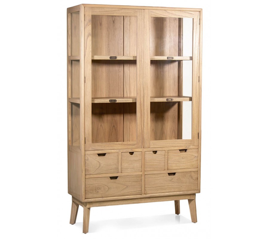 Škandinávska presklená masívna vitrína Bergen s asymetrickými zásuvkami a policami s bronzovými detailami 180 cm