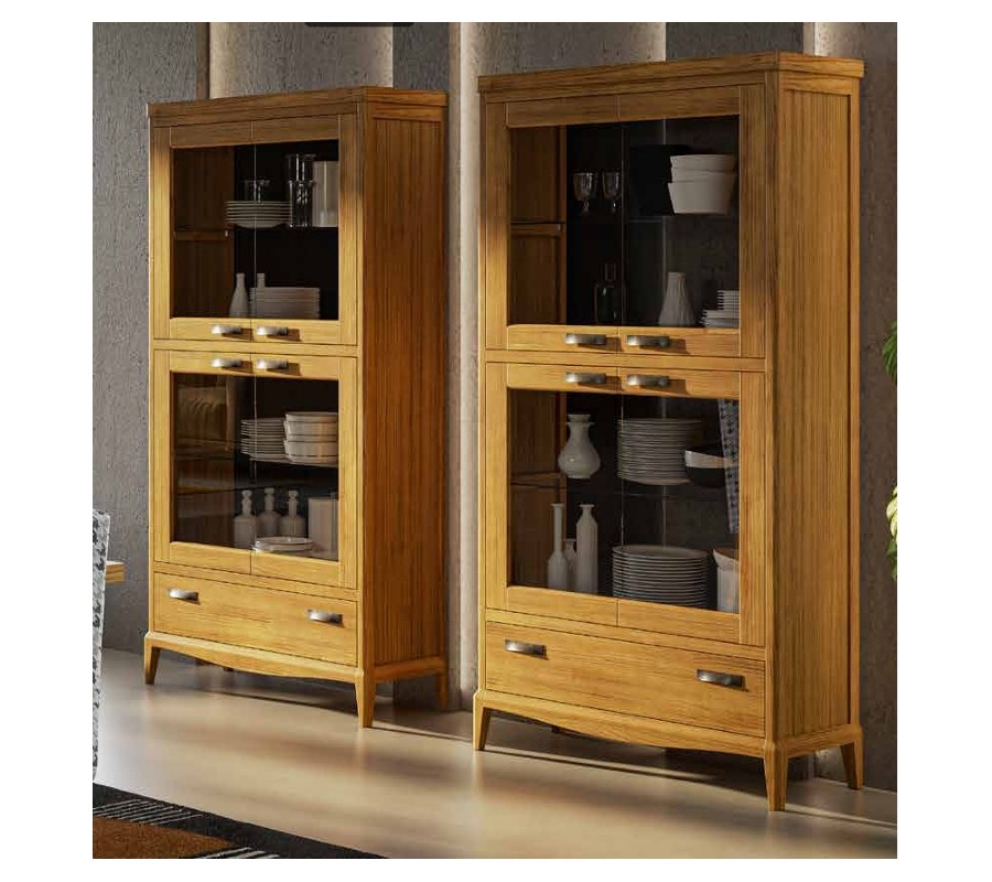 Vitrína je členená vertikálne – pozostáva z dvojice dvojdverových skriniek umiestnených nad sebou, pričom každá z nich má sklenené dvierka umožňujúce prehľadné vystavenie porcelánu, skla alebo dekorácií. V každej skrinke sa nachádza sklenená polica, ktorá opticky odľahčuje celkový vzhľad nábytku. Dvierka aj spodná zásuvka sú vybavené tvarovo výraznými kovovými úchytkami, ktoré vytvárajú jednotný dizajnový akcent.