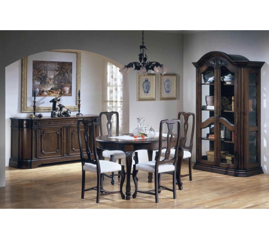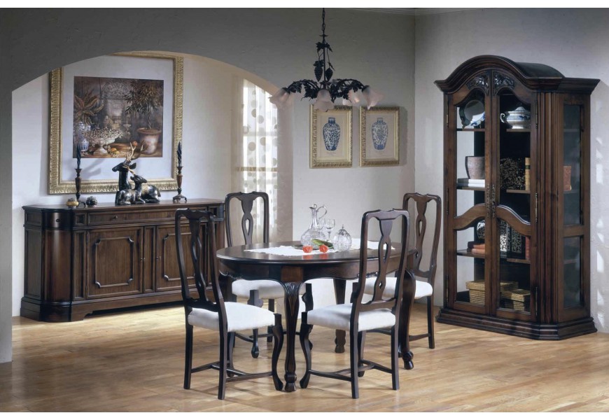 Exkluzívna jedálenská zostava Selleccion 9 predstavuje jedinečné kúsky nábytku vhodné do každej klasicky či rustikálne ladenej jedálne. Zostava vám ponúka luxusný jedálenský stôl, stoličky, vitrínu i príborník nesúce sa v jedinečnom rustikálnom či vintage štýle. Kvalitný materiál sa snúbi s eleganciou, luxusným prevedením a bohatým ornamentálnym zdobením. Vzniká tak jedinečná zostava, ktorá zjednotí každý priestor a vnesie k vám domov historický nádych luxusných víl!