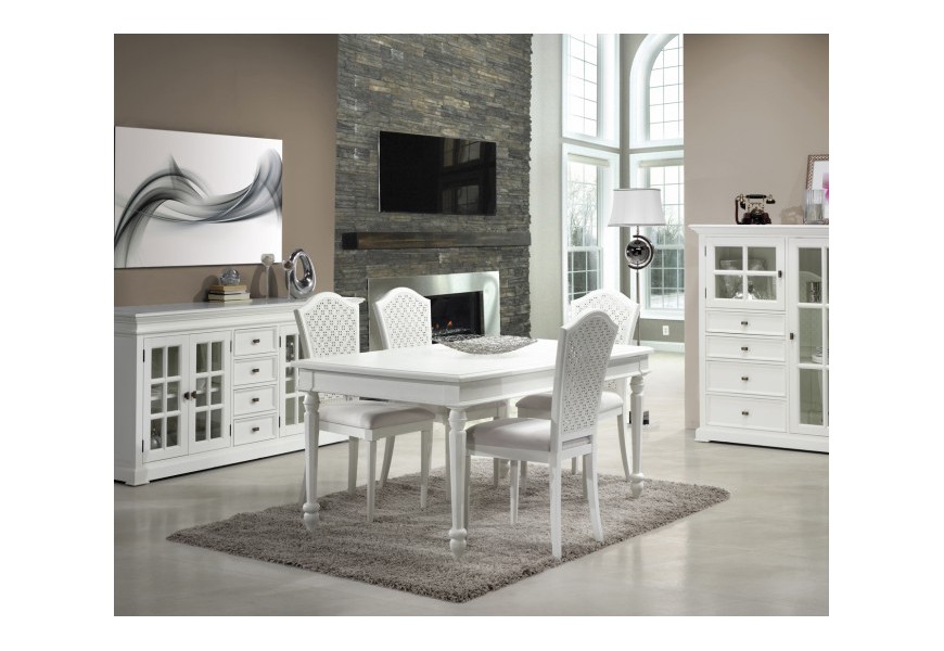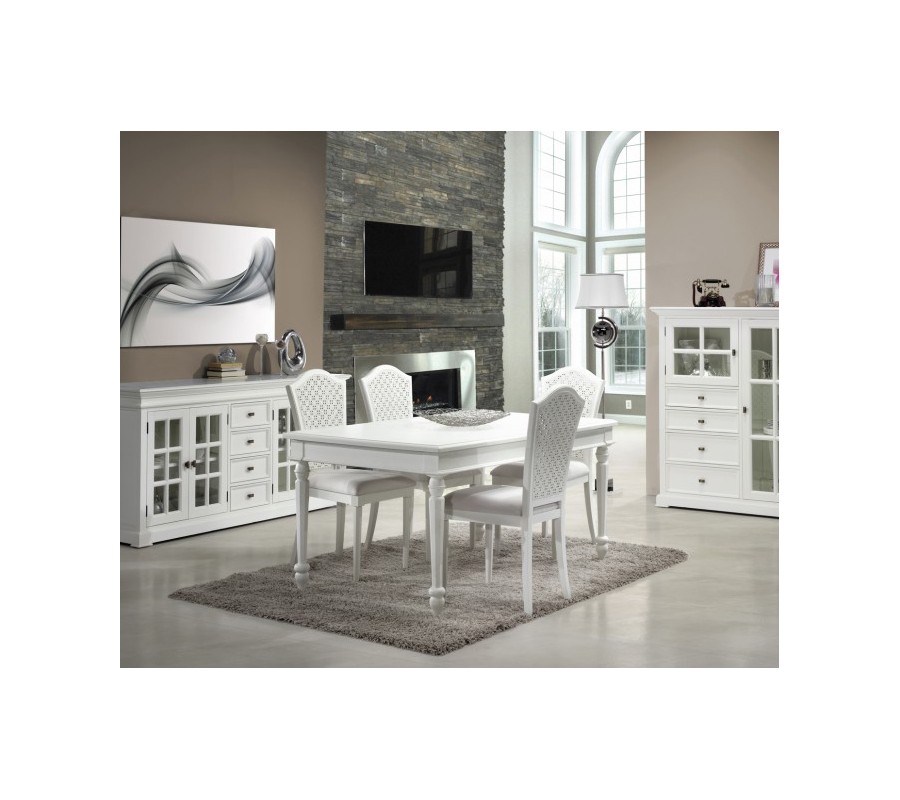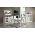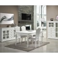 Bohémská ľahkosť rustikálneho dizajnu jedálenskej zostavy Belliene ohohatená o ručné vyrezávanie sa skvelo hodí do honosne zariadených priestranných jedální. Vyhotovenie v univerzálnej bielej farbe podčiarkuje eleganciu a pôsobí čistým dojmom. Jednotlivé kúsky sa svojimi prívlastkami budú vynímať aj v provensálsky ladených jedálňach v kombinácii s pastelovými stenami a florálnymi motívmi. Detaily v podobe presklených dvierok príborníkov nechávajú priestor zažiariť vašim cenným zberateľským kúskom porcelánu či príboru. Ak hľadáte nábytok, ktorý zaručene z módy nevyjde, s jedálenskou zostavou Belliene rozhodne krok vedľa neurobíte. K zostave patrí široký príborník s úložným priestorom vo forme presklených skriniek a zásuviek, jedálenského rozkladacieho stola s okrúhlymi vyrezávanými nohami s jedálenskými stoličkami s čalúnenou sedaciou plochou a krásna komoda s bohatým variujúcim úložným priestorom.
