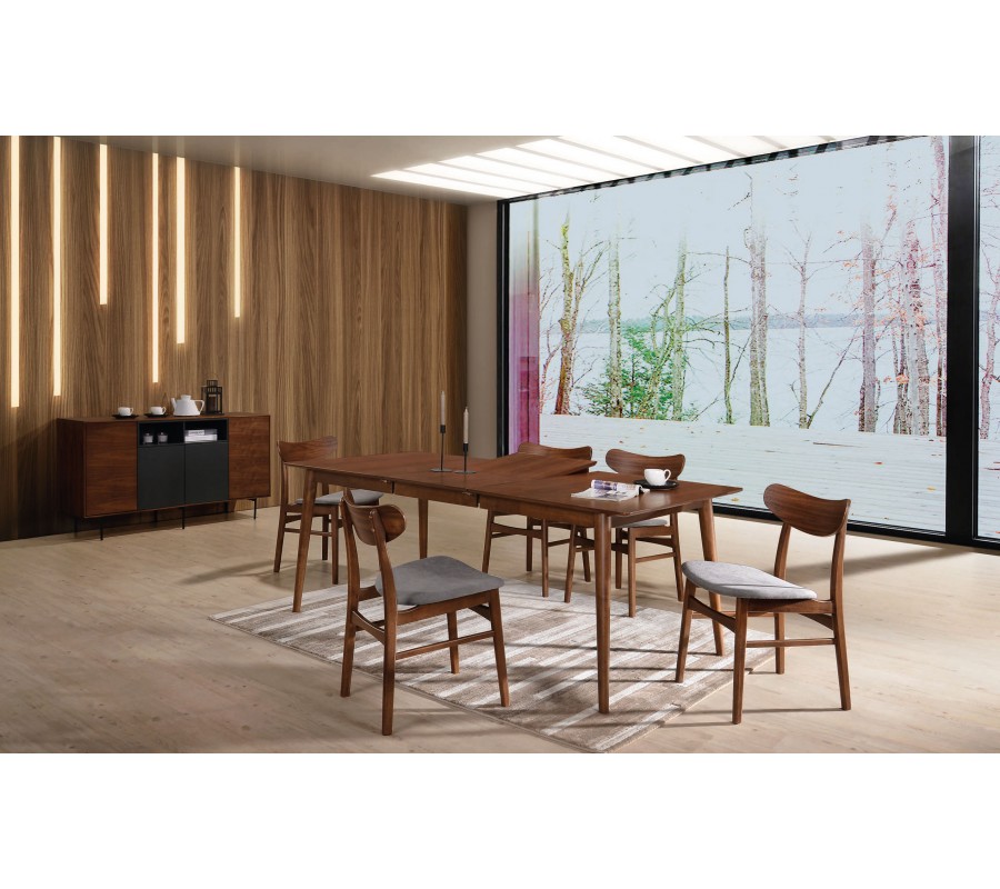 V zostave Nordica Nogal dopĺňa prírodný materiál čierna a sivá farba. Vzniká tak pre škandinávsky štýl typický farebný akcent, ktorý dodáva nábytku sofistikovaný vzhľad. V tvaroch nábytku dominujú rovné línie a jedálenská zostava tak pôsobí moderným minimalistickým dojmom, s drevom v hlavnej úlohe.