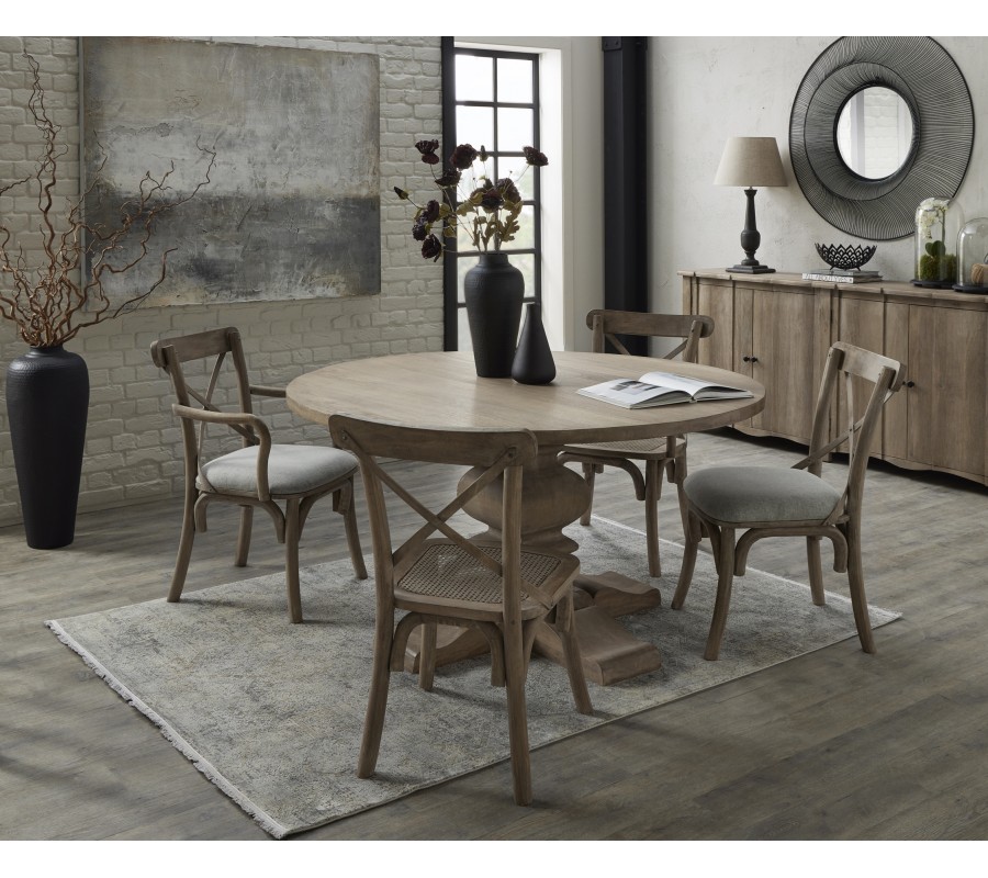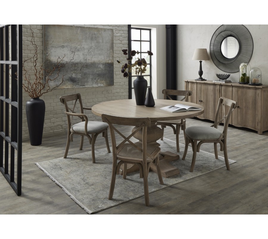 Vpustite do svojej jedálne šarm a útulnosť vidieckeho štýlu s jedálenskou zostavou Antiquités Francaises. Okrúhly jedálenský stôl s majestátnou vyrezávanou nohou bude očarujúcim stredobodom vašej jedálne. Skvele ho doplnia stoličky s elegantnými krivkami a ratanovým výpletom. Praktický úložný priestor vám poskytne príborník s vyrezávanými detailmi. Nábytok je vyrobený z masívneho dreva v sivom prevedení s takzvaným washed efektom vymytej farby, ktorý mu dodáva očarujúci vintage charakter. Akáciové drevo je obľúbené kvôli svojej pevnosti a odolnosti. Kolekcia Antiquités Francaises je inšpirovaná dizajnom historického francúzskeho nábytku. V kombinácii so starožitnou povrchovou úpravou a fúziou moderných tvarov pôsobí nadčasovým dojmom. Tento nábytok tak vďaka jedinečnému dizajnu odoláva módnym trendom a vďaka kvalitnému materiálu aj každodennému používaniu. Vydrží vám roky a v jedálni zariadenej zostavou Antiquités Francaises si tak užijete mnoho spoločných chvíľ s rodinou a priateľmi.