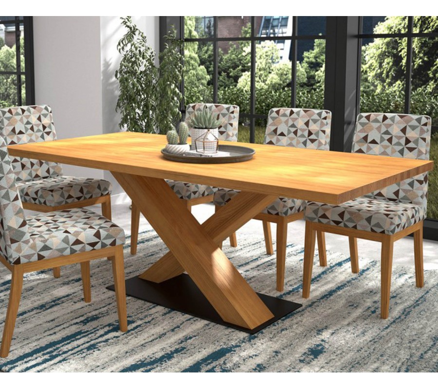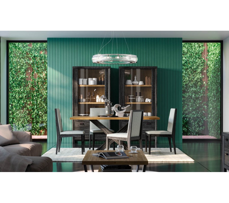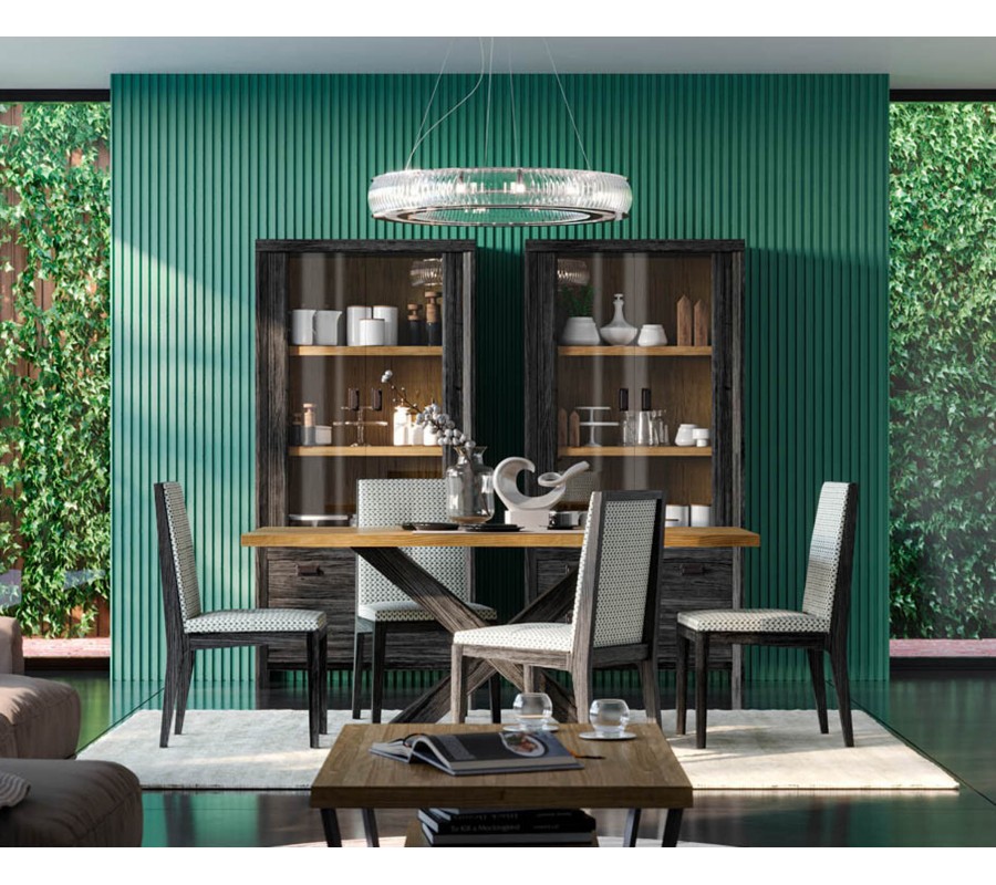 V dizajne nábytku dominujú rovné línie a hladké povrchy, čo mu dodáva moderný vzhľad. Viditeľná štruktúra dreva vizuálne oživí rovné plochy. Atypická podstava stola zasa zabezpečuje výbornú stabilitu a zároveň dodá jedálni zaujímavý dekoračný prvok. Vitrína vám poskytne bohatý úložný priestor na riady či vaše obľúbené dekorácie a čalúnené stoličky zaručia komfort aj počas dlhšieho sedenia.