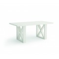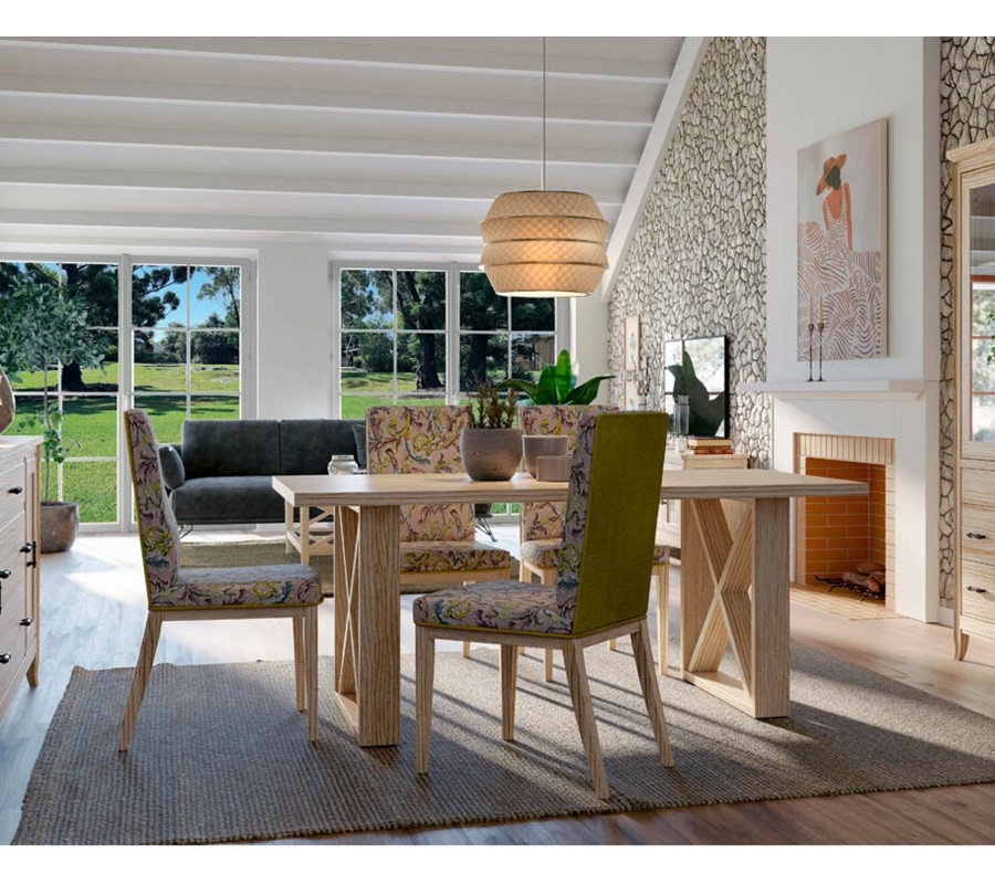 V tvaroch nábytku prevažujú moderné rovné línie a hladké povrchy, oživené jemnými zakriveniami nožičiek a prečnievajúcimi rímsami, ktoré prinášajú do dizajnu nádych vidieckej estetiky. S touto tendenciou korešponduje aj zhotovenie z kvalitného masívneho dreva a podstava stola s dizajnovými nožičkami v tvare X.