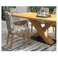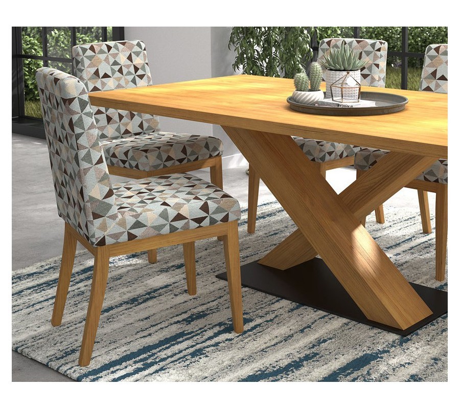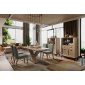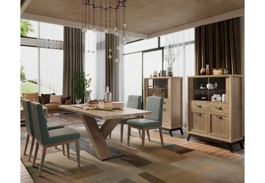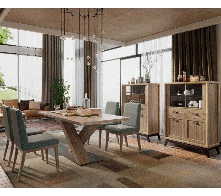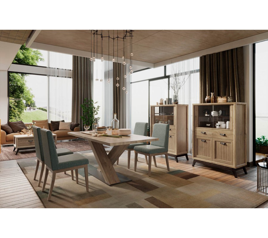 V dizajne dominujú rovné línie a pre túto zostavu charakteristické zošikmené nožičky. Váš pohľad upúta aj atypická podstava jedálenského stola s prekríženými nožičkami. Pohodlné sedenie vám zaručia stoličky s čalúnenou sedacou časťou a opierkou chrbta. Vitrína s presklenými dvierkami vo vrchnej časti a uzavretým úložným priestorom v spodnej časti vám poskytne dostatok miesta na riady či vaše obľúbené dekorácie. V jedálenskom priestore prepojenom s obývačkou oceníte tiež konferenčný stolík s korešpondujúcim dizajnom.