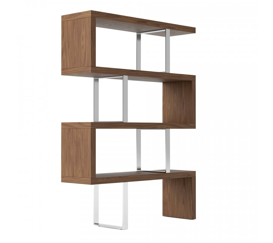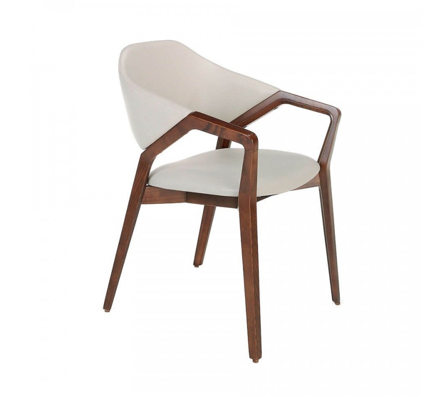 V centre zostavy sa nachádza masívny jedálenský stôl s vrchnou doskou s dizajnom bieleho mramoru. Priestoru dodá naturálny dekoratívny element a lesklý povrch zároveň vďaka odrazom svetla miestnosť rozžiari. Drevo v orechovom hnedom odtieni pôsobí teplým dojmom a pomôže vytvoriť útulnú atmosféru. Prírodné materiály výborne dopĺňa aj kožené čalúnenie stoličky s neutrálnom norkovom odtieni béžovej. Jej moderná silueta sa výborne prepojí s asymetrickým dizajnom regálu a zdôrazní moderný štýl.