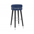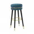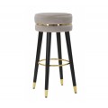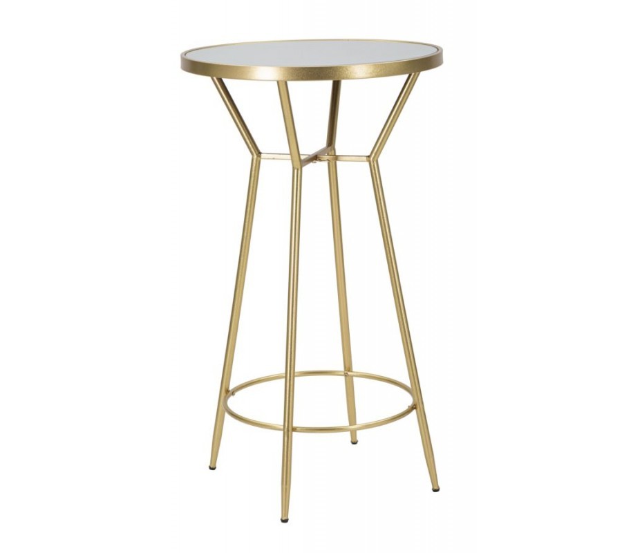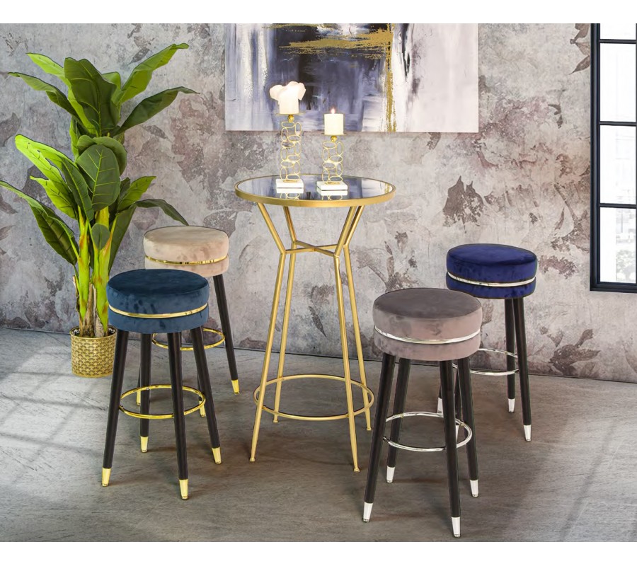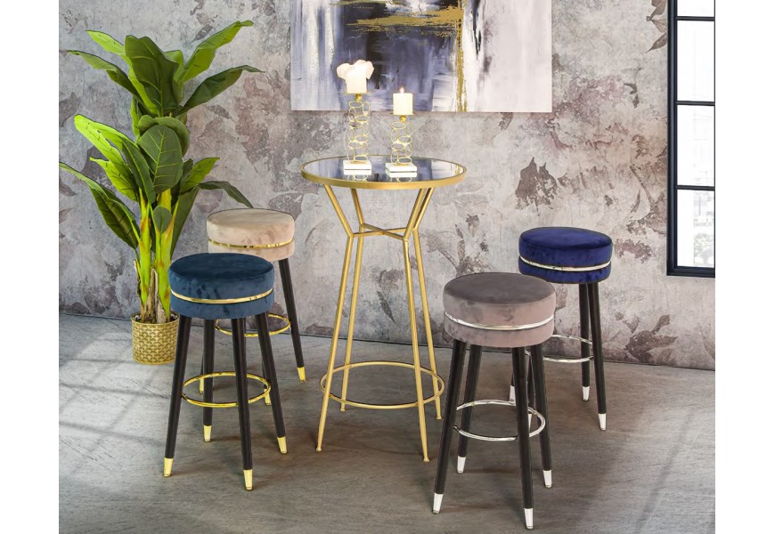 V centre zostavy sa nachádza okrúhly barový stôl s kovovu konštrukciou v zlatej farbe a so zrkadlovou vrchnou doskou. Je doplnený čalúnenými okrúhlymi stoličkami z našej kolekcie Laurentia, s luxusným zamatovým poťahom a dizajnovou podstavou s okrúhlou opierkou na nohy. Je len na vás, či sa rozhodnete skombinovať stoličky rovnakej farby pre harmonický konzistentný vzhľad, alebo zvolíte eklektickejší prístup s variáciou viacerých odtieňov. V každom prípade, lesklé zlaté a strieborné detaily budú výborne korešpondovať so stolíkom.