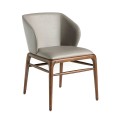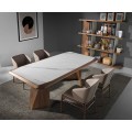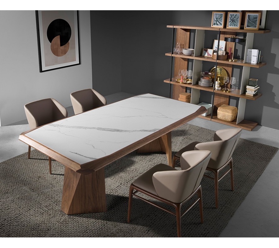 V zostave dominuje drevo v bohatom hnedom orechovom odtieni. Jemná kresba letokruhov podčiarkuje prírodný charakter materiálu a v rovnakej tendencii nasleduje aj dizajn vrchnej dosky stola v podobe bieleho mramoru s jemným sivým žilkovaním a poťah stoličiek z ekokože v exkluzívnom svetlom norkovom odtieni béžovej.