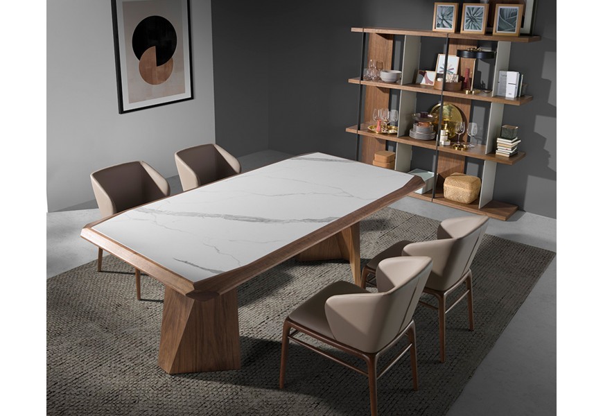 Luxusná jedálenská zostava Forma Moderna z dreva v orechovej farbe s bielym mramorom a kožou v norkovom odtieni