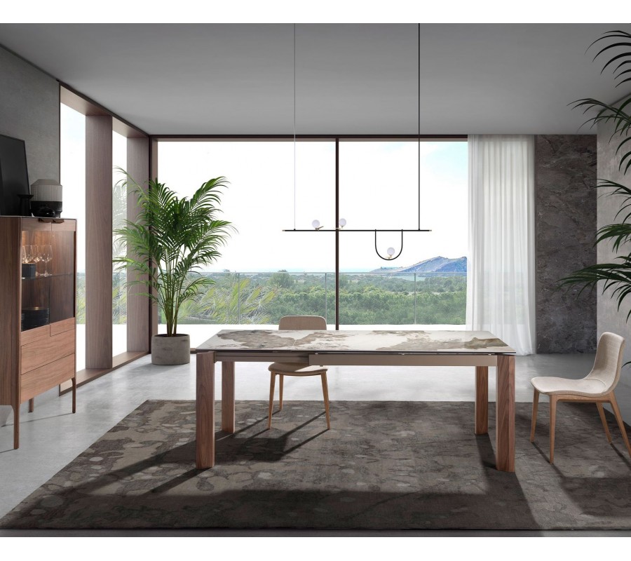 Mramor výborne dopĺňa drevo v bohatej orechovo hnedej farbe s jemnou kresbou letokruhov. Oživuje minimalistické siluety a zároveň zdôrazňuje prírodnú estetiku. Harmonický vzhľad zavŕši textilný poťah stoličiek v jemnej béžovej farbe s dizajnom ľanu.