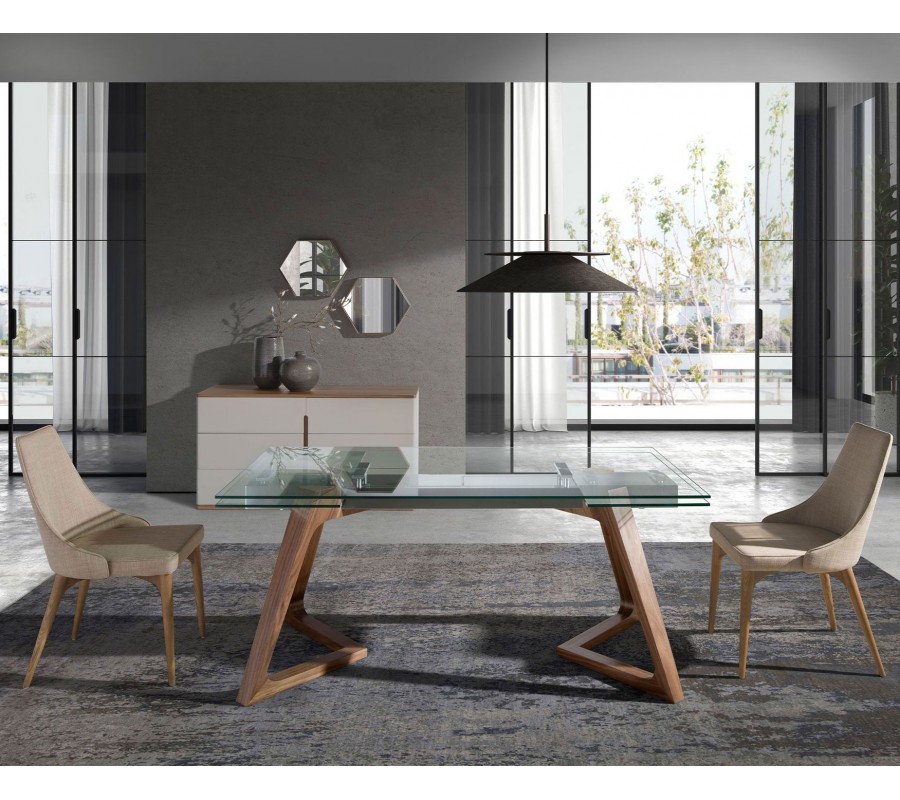 V centre zostavy sa nachádza jedálenský stôl s priehľadnou sklenenou vrchnou doskou. Sklo zdôrazňuje moderný charakter nábytku a zároveň necháva vyniknúť dizajnovú podstavu z orechovo hnedého dreva. Materiálovo korešponduje s nožičkami stoličky a akcentovou komodou. Oblačná sivá farba zasa prináša do miestnosti sofistikovaný farebný element.