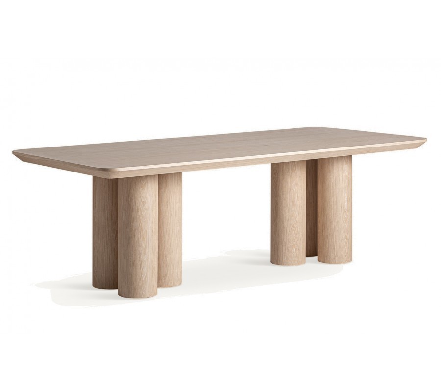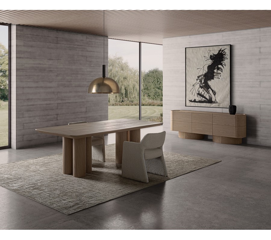 V zostave dominujú geometrické tvary, elegantné zaoblené krivky a minimalistické zdobenie. Obdĺžnikový jedálenský stôl a komoda sú vyrobené z kvalitnej pravej dubovej dyhy. Svetlá hnedá farba dreva so subtílnou štruktúrou letokruhov vyzdvihuje prírodný a harmonický vizuál. Poťah jedálenských stoličiek z buklé prináša mäkkosť a komfort . Ich biely off-white odtieň výborne korešponduje s teplým charakterom dreva.