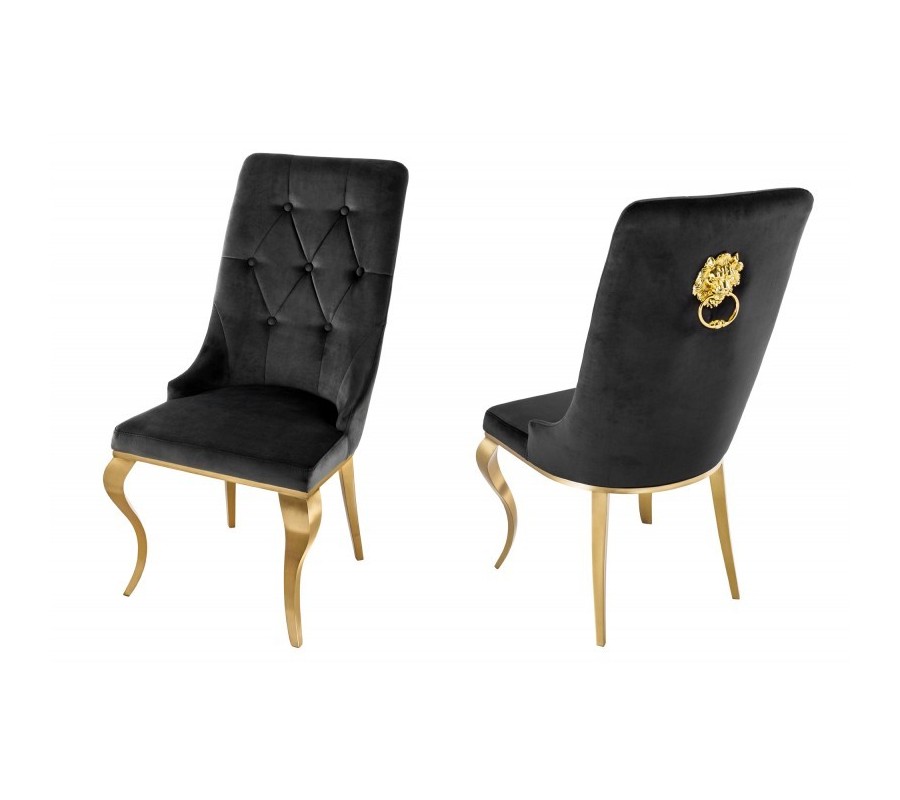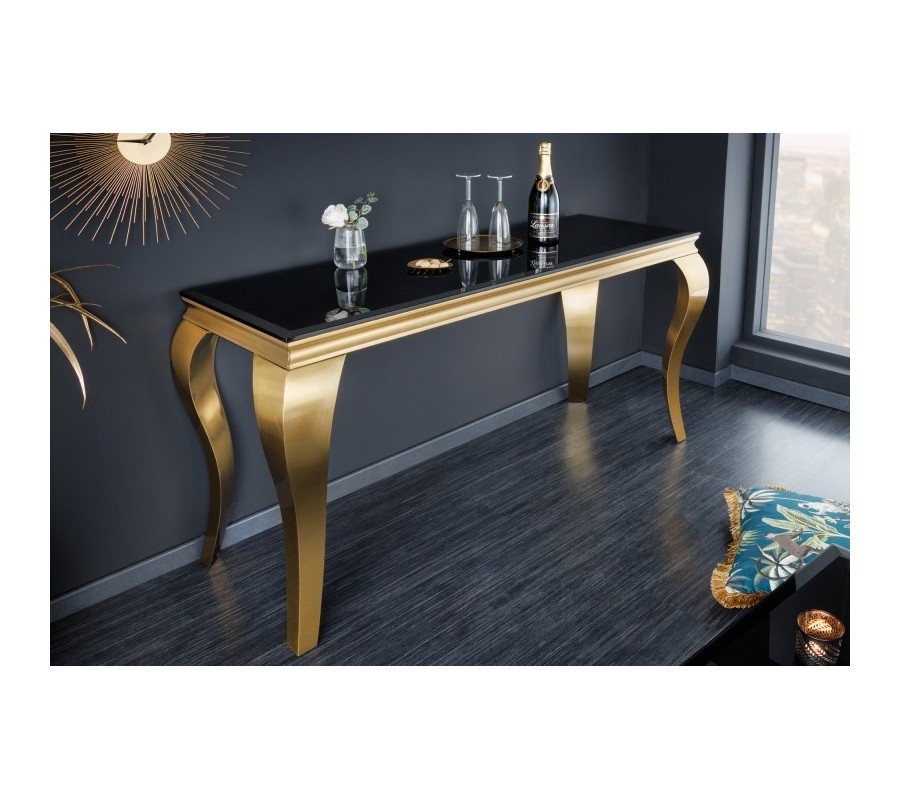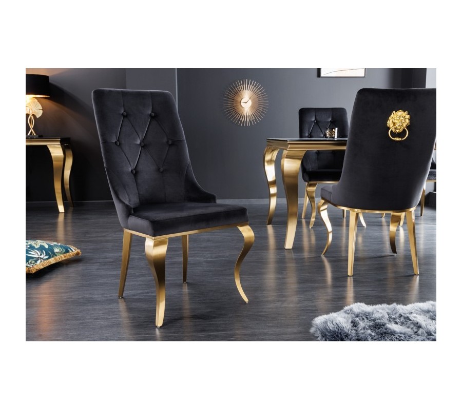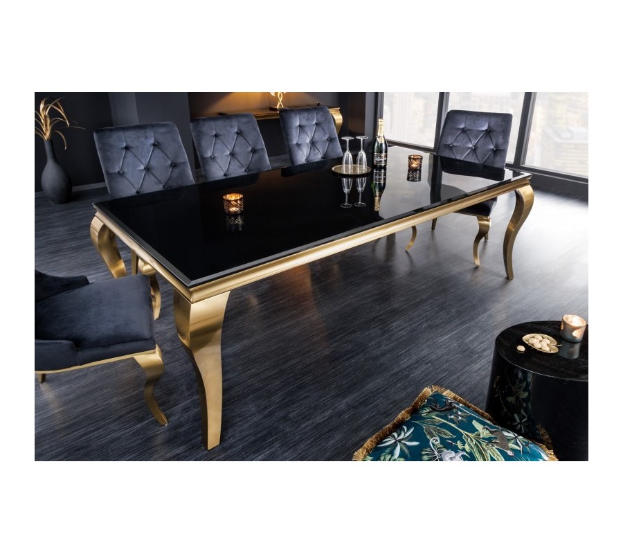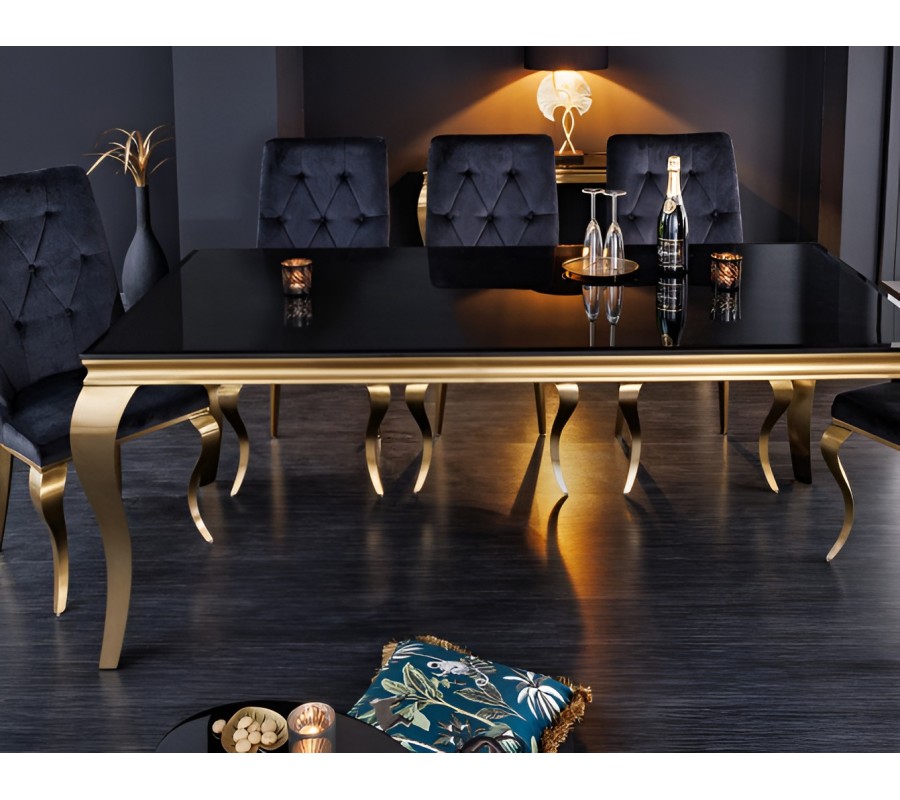 Jedálenská zostava Gold Barock prináša luxusný barokový nádych v modernom glamour štýle. Dominantným prvkom je jedálenský stôl v rôznych rozmeroch so zlatými kabriolovými nožičkami a s lesklou čiernou doskou z opálového skla, ktorý pôsobí elegantne a zároveň reprezentatívne.