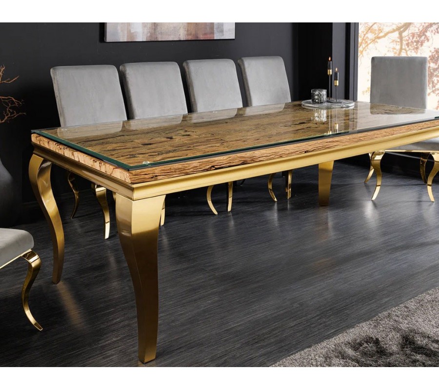 Jedálenská zostava Modern Barock je navrhnutá pre milovníkov luxusného a reprezentatívneho interiéru. Dominantou je obdĺžnikový jedálenský stôl s prírodným dreveným akcentom a čírou sklenenou doskou, ktorá pôsobí vzdušne a elegantne. Jeho zlatá kovová konštrukcia s charakteristickými kabriolovými nožičkami dodáva celej zostave noblesu a typický barokový nádych v modernom prevedení.