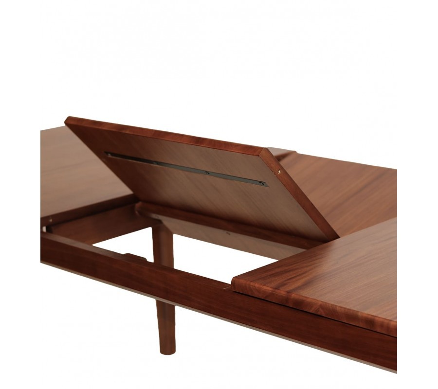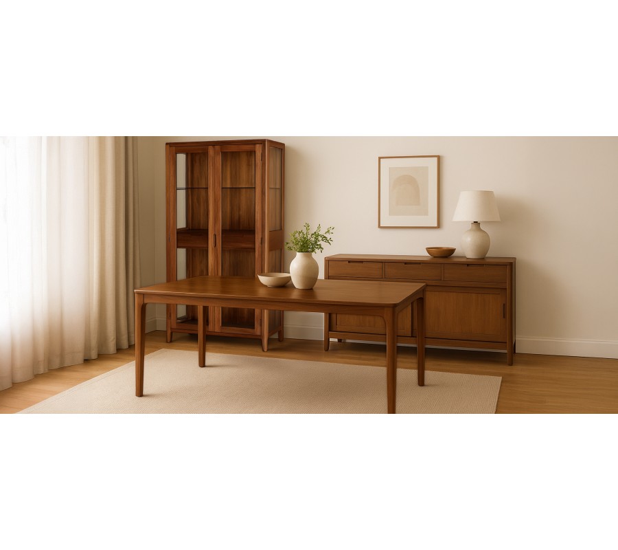V centre zostavy sa nachádza obdĺžnikový jedálenský stôl s rozkladacou funkciou a maximálnou dĺžkou 240 cm, ktorý poskytne stolovacie miesto pre až desať osôb. Dopĺňajú ho praktické úložné priestory. Dvojdverová vitrína s presklennými dvierkami, štyrmi policovými miestami a dvomi zásuvkami je ideálna na vystavenie keramiky, porcelánu či krištálu. Príborník s dvojitými posuvnými dvierkami a tromi zásuvkami zasa uskladní riady či textílie. Priestor môžete doplniť aj ďalším nábytkom z rovnakej kolekcie Liberia.