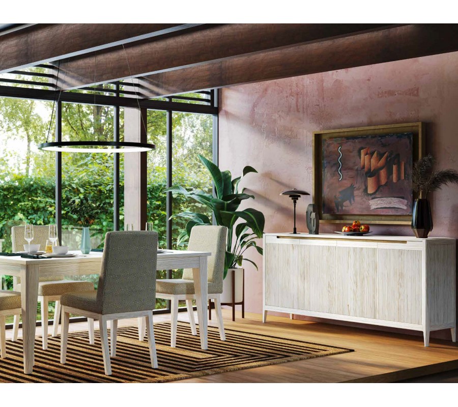 Stredobodom zostavy je praktický rozkladací obdĺžnikový jedálenský stôl, ktorý je dostupný v dvoch veľkostných rozmeroch. Jeho mierne zošikmené nožičky zabezpečujú výbornú stabilitu a zároveň krásne korešpondujú s dizajnom stoličiek. Čalúnenie zvyšuje komfort a poťah prinesie do miestnosti štýlový akcent, či už v jednofarebnom alebo vzorovanom prevedení. Zostavu dopĺňa štvordverový príborník, poskytujúci bohatý úložný priestor. Jeho dvierka zdobí vertikálne rebrovanie, inšpirované art deco štýlom a tento luxusný vizuál zdôrazní aj mramorová vrchná doska.