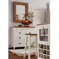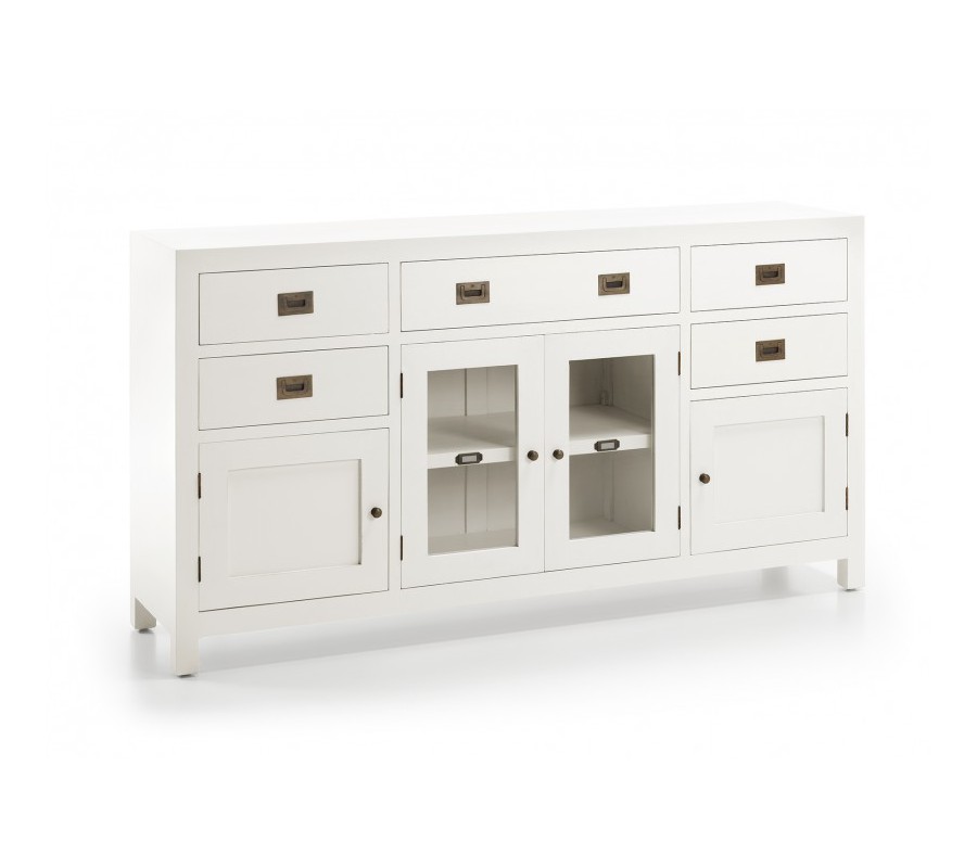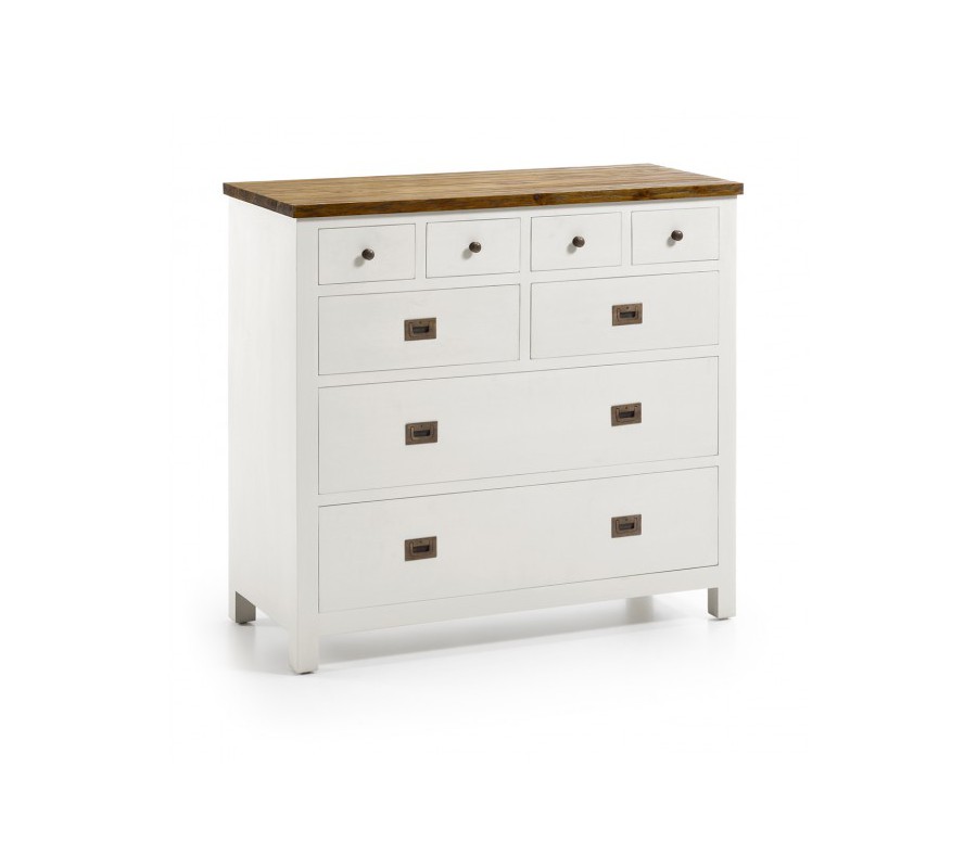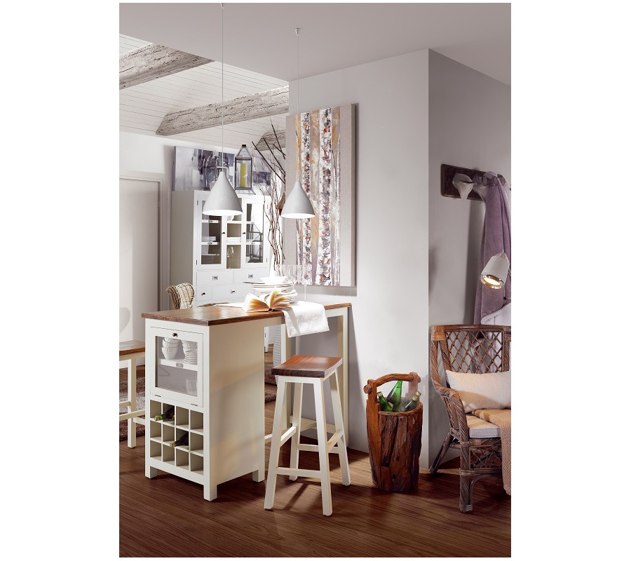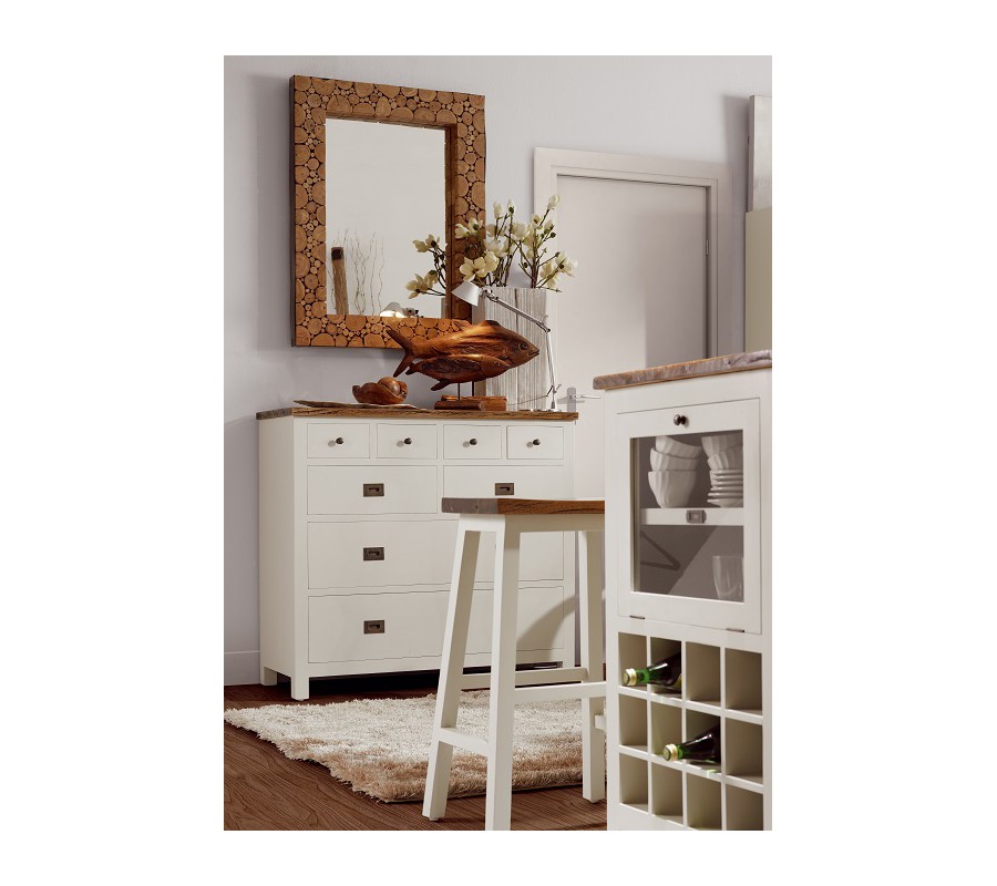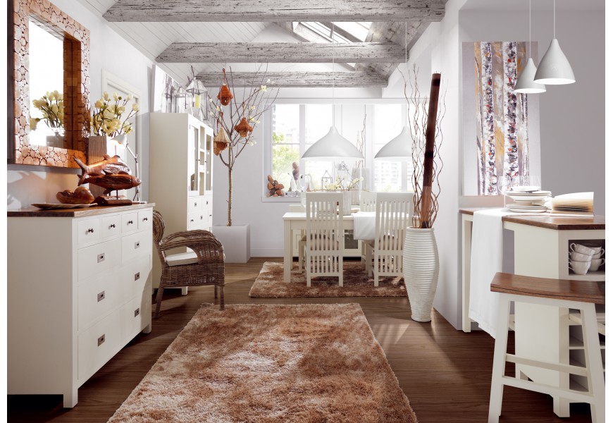 Nábytok z masívneho TEAKOVÉHO DREVA s bielou matnou povrchovou úpravou, kusy s tmavou vrchnou doskou sú vyrobené z dreva CAOBA (mahagon) s výraznou štruktúrou dvera a nerovným, hladkým a lesklým lakovaným porvchom.