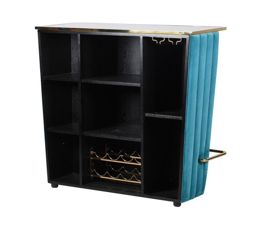 Barový pult v Art-deco štýle zaručene rozžiari každý priestor najmä vďaka svojmu špeciálnemu tyrkysovému poťahu zo zamatu, ktorý má pekný lesklý efekt. Barový pult je z bočných strán a z prednej strany vertikálne prešívaný a taktiež je doplnený o zlaté kovové prvky. Kovový prvok z pozlátenej nehrdzavejúcej ocele slúži ako opierka na nohy. Z vrchu je taktiež umiestnená doska zo skla, ktorá je vložená do kovového rámu v lesklej zlatej farbe. Bar je prakticky vybavený šiestimi poličkami a držiakmi na víno a poháre. Tento nadčasový elegantný dizajn krásne vynikne v tmavých priestoroch, kde bude dominovať a vytvorí kontrastný prvok. Miestnosť v ktorom sa bar nachádza odporúčame doplniť s dekoratívnymi predmetmi, ako napríklad s vázou, misou, alebo hodinkami v zlatej farbe. K barovému pultu nájdete aj tyrkysové barové stoličky v rovnakom Art-deco štýle.