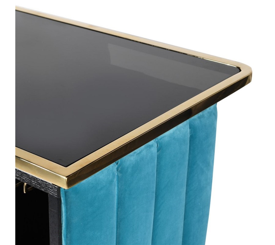 Art-deco tyrkysový barový pult so zamatovým poťahom a sklenenou doskou 120 cm
