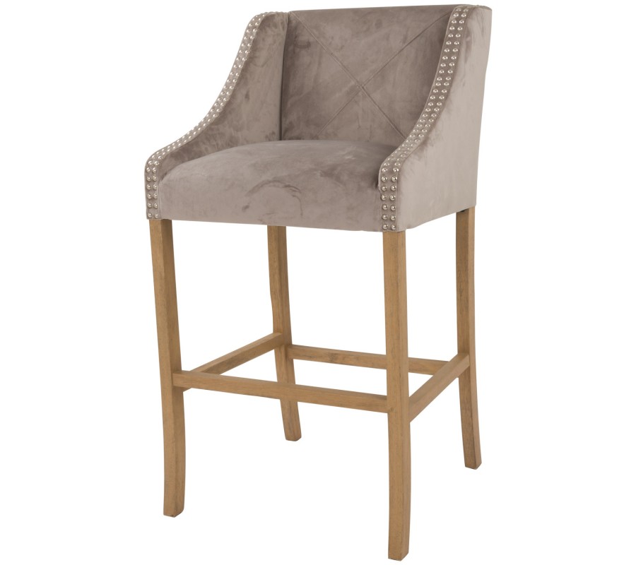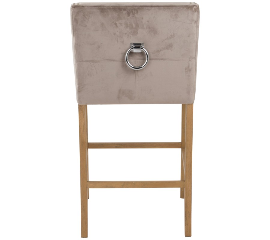 Luxusná barová stolička Chelsea predstavuje prepojenie moderných prvkov a nadčasovej elegancie. Zaujme svojím príjemným zamatovým čalúnením v univerzálnej béžovej farbe, ktoré vkusné prešívanie. Poťah dopĺňajú svetlohnedé drevené nožičky z kaučukového dreva, ktoré je známe najmä svojou hustou štruktúrou a pevnosťou. Aj vďaka tomu je stolička skutočne udržateľným a trvácnym doplnkom do vášho interiéru. Jedinečnú atmosféru dotvorí aj detailné zdobenie v podobe strieborných kovových cvokov a dizajnového krúžku na zadnej strane operadla. Vďaka neutrálnej farebnosti je táto barová stolička kúskom, ktorý poľahky doladíte aj do farebnejšie ladených priestorov. Hodí sa ako doplnok luxusných obývačiek a jedální, ale príjemne doplní aj barové priestory hotelov, lobby barov či kaviarní. Stolčky Chelsea odporúčame kombinovať aj s ďalšími rovnomennými kúskami z našej kolekcie.