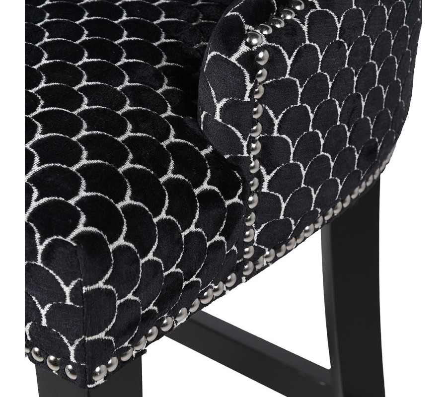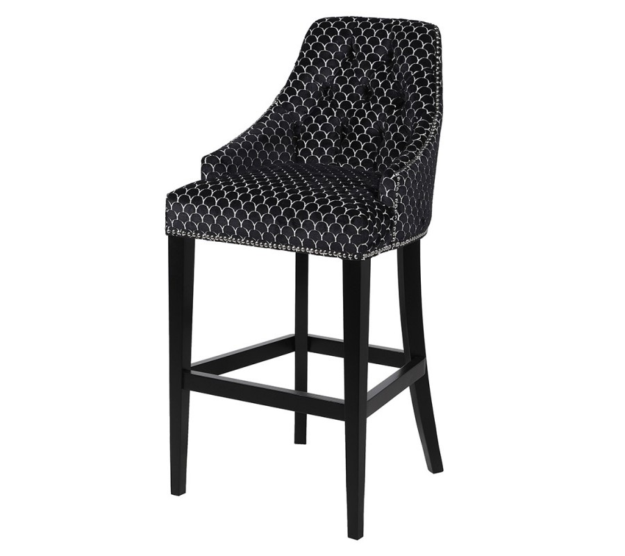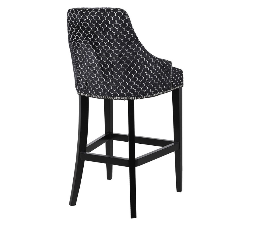 Štýlová barová stolička Breca je vďaka svojmu jedinečnému čalúnenie veľmi krásnym a zaujímavým kúskom, ktorý osvieži vašu jedáleň, či kuchyňu. Príjemné zamatové čalúnenie v čiernej farbe so striebornými dizajnovými cvokmi je doplnené horizontálnym vzorom v tvare oblúkov, podobajúcich sa na rybie šupiny. Komofrtný sed vám zaručí mäkká sedacia časť, chrbtová opierka s vnútorným presívaním podobným na štýl Chesterfield, a nízke bočné opierky, nesúce sa v jednej línií s chrbtovou opierkou. Barová stolička Breca taktiež disponuje vysokými drevenými nožičkami čiernej farby, ktoré sú obohatené o opierkou pre nohy. Čierna barová stolička Breca v art-deco štýle vynikne v interiéroch s čiernym nábytkom a doplnkami, v kombinácií s bielymi prvkami.