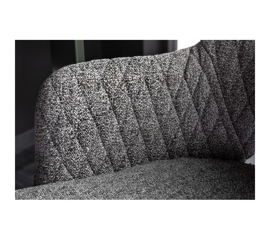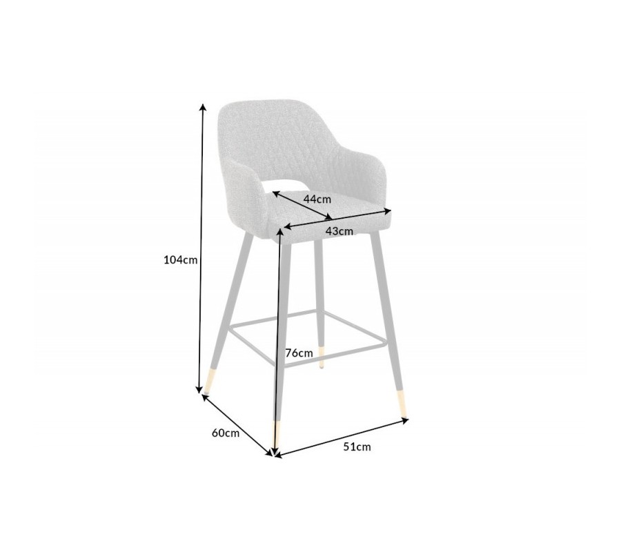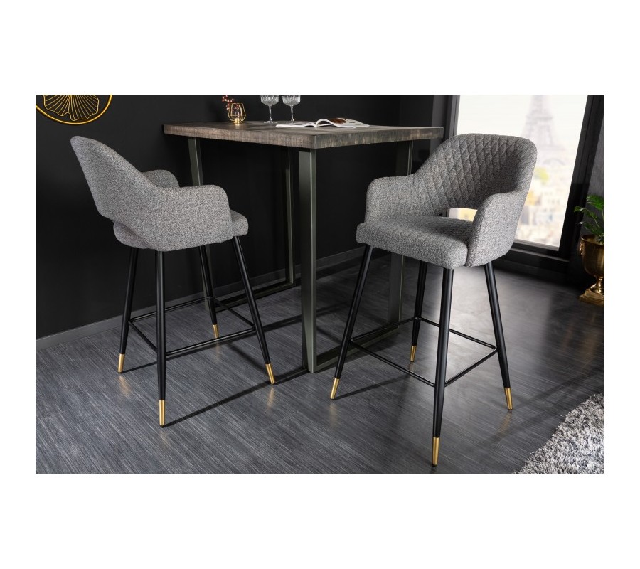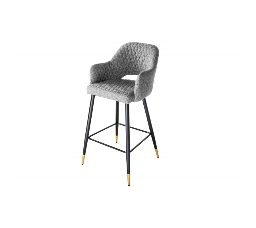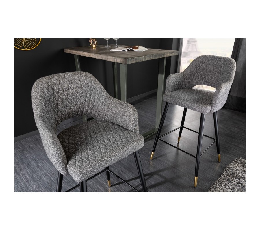 Univerzálne farebné prevedenie, ktoré sa výnimočne hodí do moderných art deco interiérov vás nadchne pri pohľade na barová stoličku z kolekcie Fribourg na čiernych kovových nožičkách. Matné čierne prevedenie konštrukcie je štýlovo doplnené o zlaté detaily na špičkách nožičiek podčiarkujúce eleganciu a umeleckú dušu art deco nábytku. Samotná sedacia časť stoličky je čalúnená polyesterovou poťahovou látkou v sivej a bielej farbe s pretkávaním a kosoštvorcovým prešívaním. Poťahová látka sa veľmi jednoducho udržuje a čistí vlhkou mikrovláknovou handričkou. Stolička z kolekcie Fribourg má po bokoch oblé opierky na ruky zabezpečujúce dokonalý komfort sedenia. Dizajnovým prvkom tjeto barovej stoličky je aj oblý výrez v spodnej časti opierky na chrbát. Výborne sa bude kombinovať s pastelovými farbami na kobercoch či stenách a vynikne v moderných kuchyniach, jedálňach či obývačkách spojených s kuchynskou časťou.