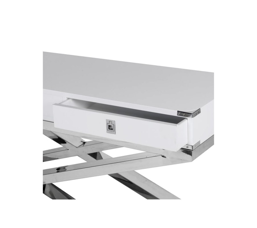 Predstavujeme Vám luxusný futuristický odkaz kolekcie Wielton Blanc. Táto masívna konzola je vyrobená z mahagónového dreva a stojí na dominantnom kovovom podstavci tvarovanom do X. Disponuje troma zásuvkami s chrómovými doplnkami. Jedinečný vzhľad vzniká kontrastom jednoduchého dizajnu na dominantnej konštrukcii podstavca a detailov spracovania doplnkových prvkov. Táto konzola sa hodí do moderných interiérov a vynikne v kombinácií s kovovými prvkami a koženými materiálmi.