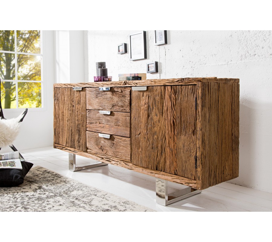 Telo príborníka je vyrobené z recyklovaného teakového dreva v naturálnej svetlej hnedej farbe. Tento materiál je ekologický a zároveň prepožičiava nábytku jedinečný organický vizuál s prírodnými prasklinami a štruktúrami, ktoré pôsobia autentickým vintage dojmom. Výrazný kontrast tvoria kovové úchytky a nožičky s lesklým chrómovým prevedením, prinášajúce do kompozície dotyk moderného štýlu.