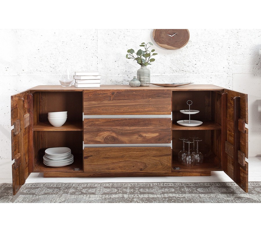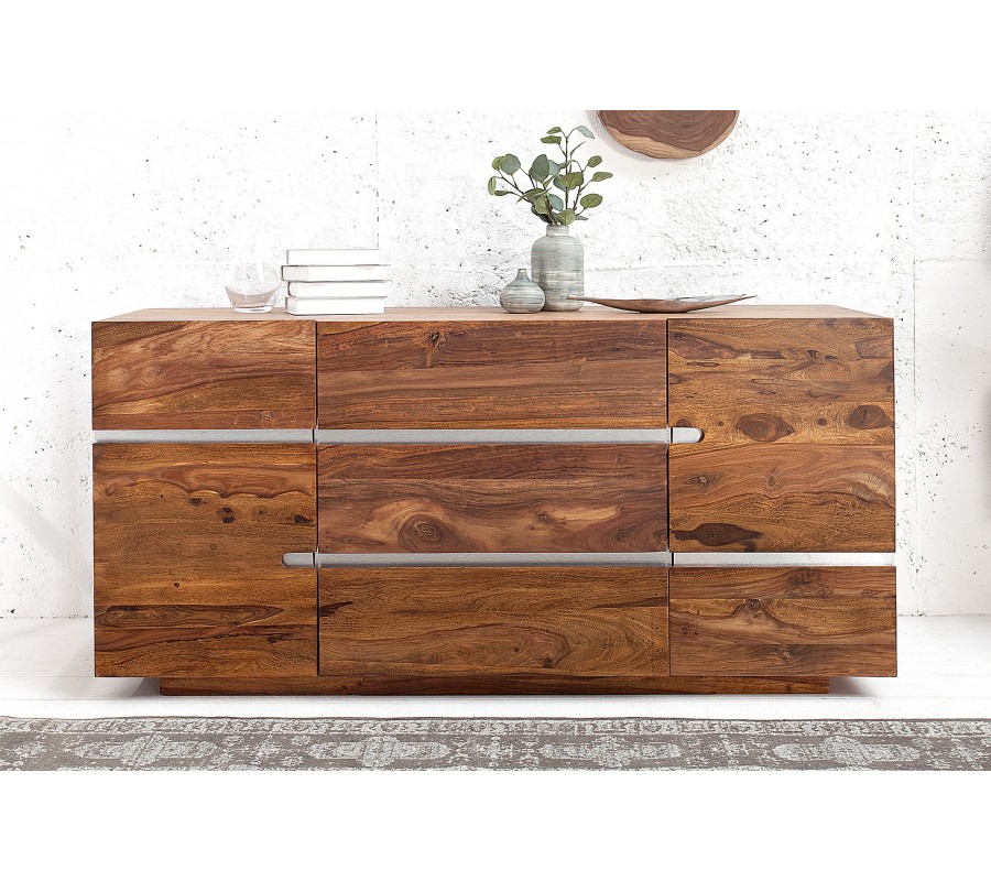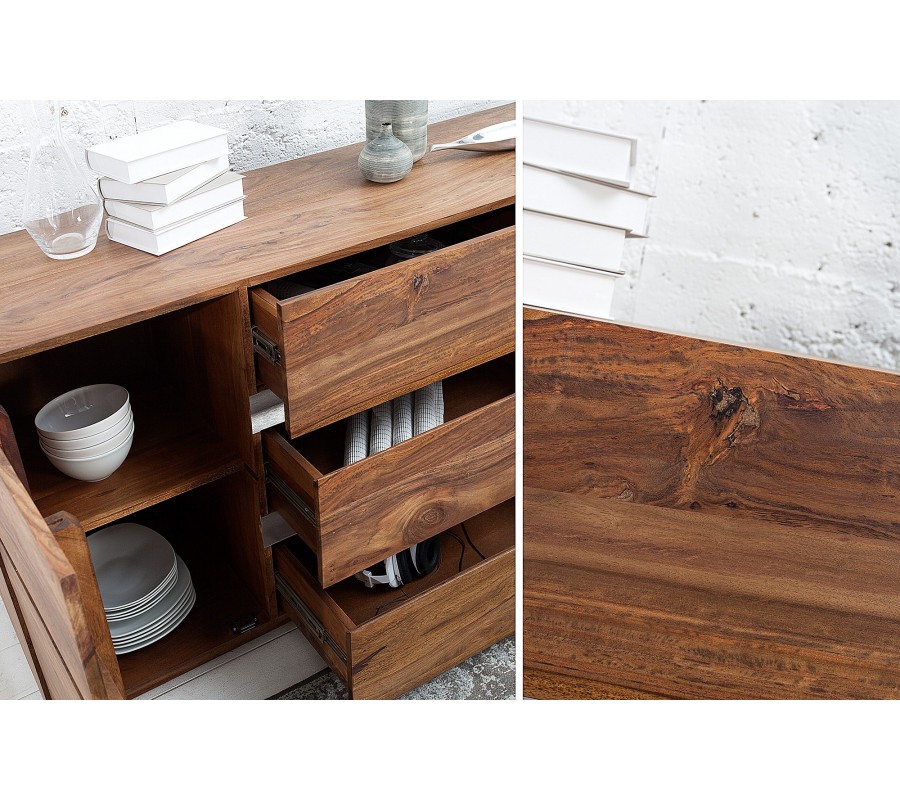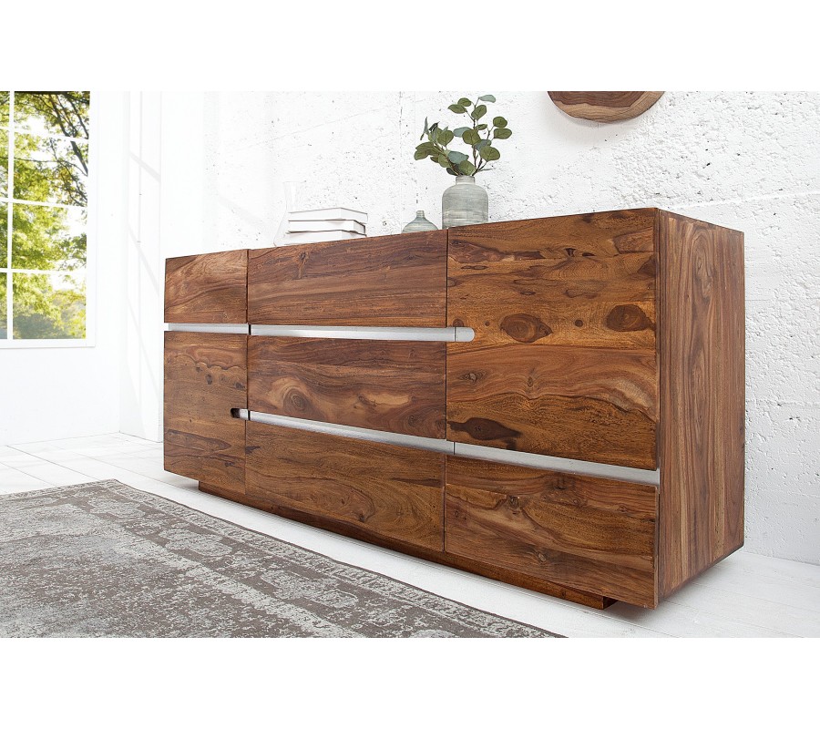 Luxusný masívny príborník Goon vyniká svojím robustným telom doladeného kovovými prvkami. Lakovaný povrch necháva vyniknúť jedinečnú kresbu indického palisandru, vďaka ktorej bude príborník stredom pozornosti v priestore. Ručná výroba zaručuje originalitu každého kusu.