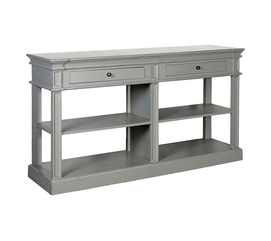 Štýlová konzola z kolekcie Riva Gris s dvoma poličkami a dvokma zásuvkami je vyrobená z masívneho topoľového dreva. Vďaka príjemným sivým odtieňom v kombinácii so zlatými prvkami osvieži Vás domov, síce sa jedná o kúsok vo vidieckom štýle, perfektne zapadne i do akéhokoľvek iného interiéru.