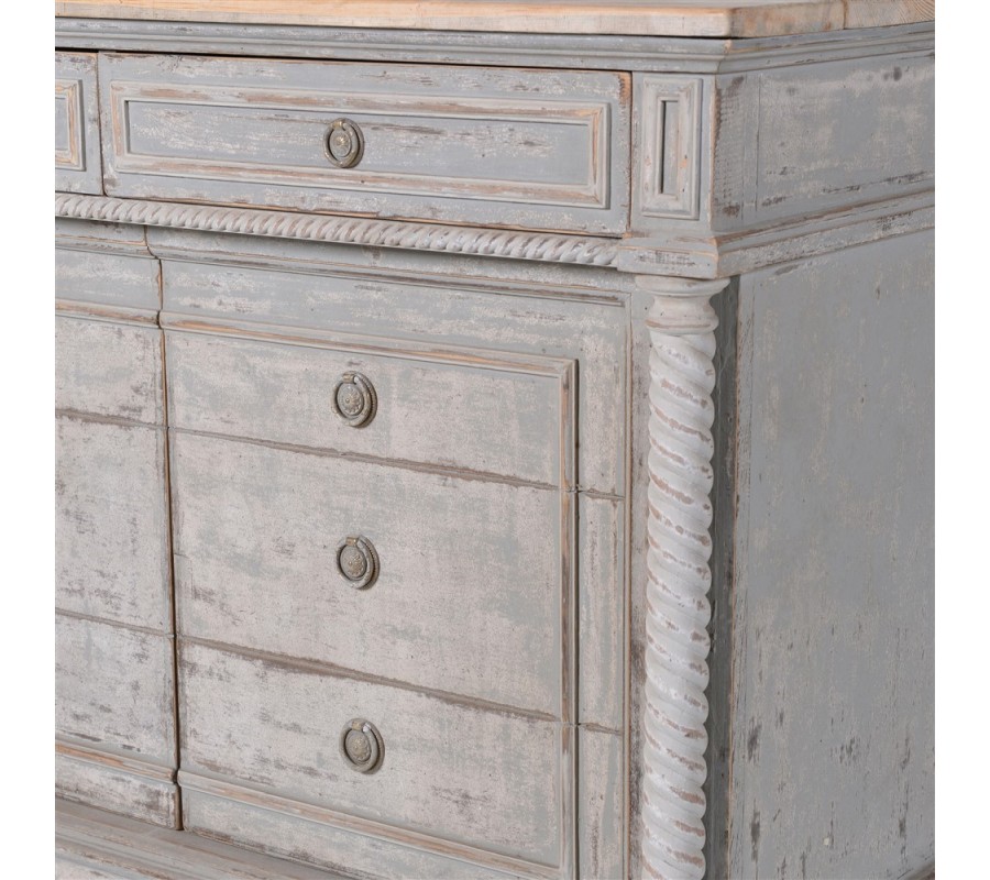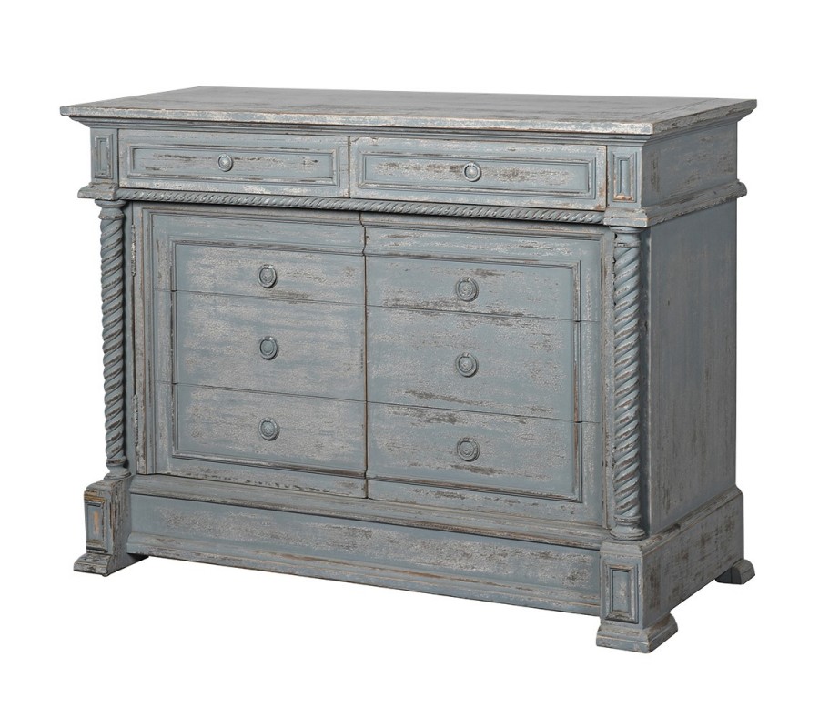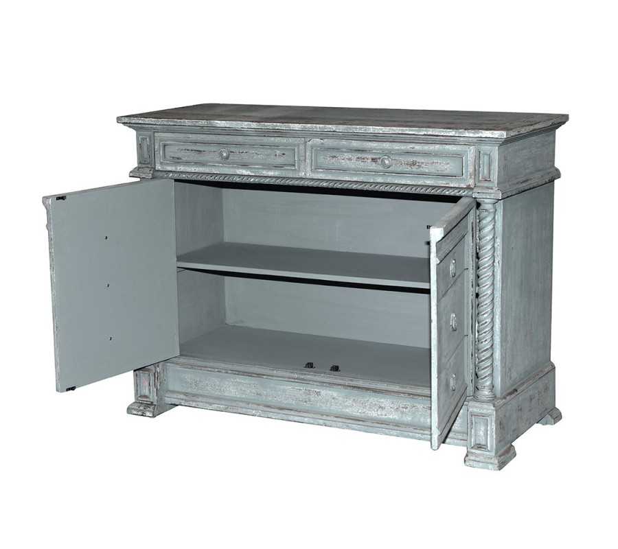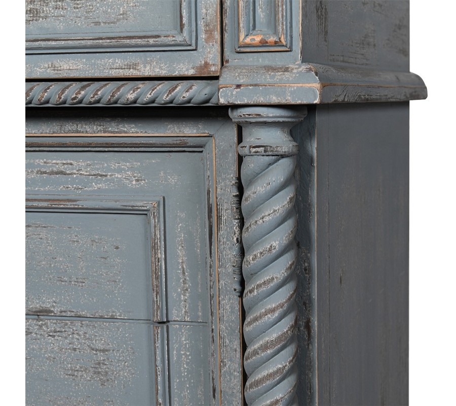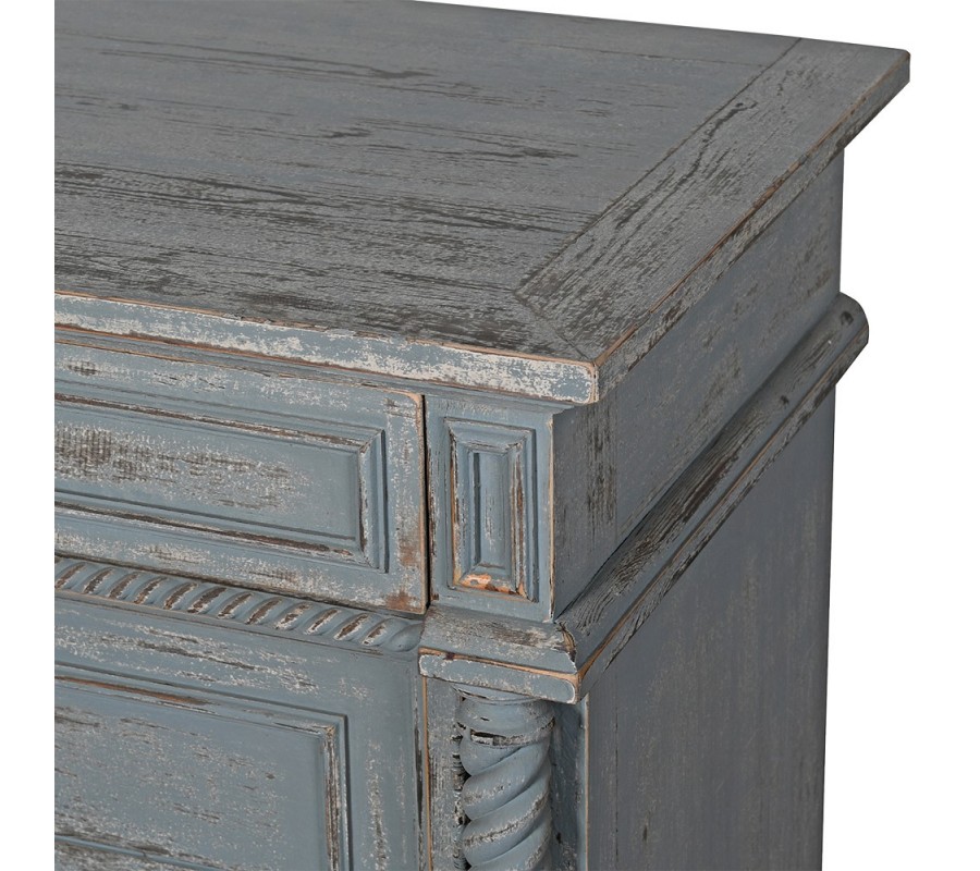 Komoda Heritage vo vintage štýle je jedinečným kúskom, ktorý Vás zaručene zaujme svojím kvalitným vyhotovením a dizajnom s ručným vyrezávaním. Vintage komoda Heritage je vyrábaná z masívneho dreva, obohateného o povrchovú úpravu s vyšúchaným zastaralým vzhľadom v staromodrej farbe, čo umocní historický vzhľad. Dominantným dizajnovým prvkom je ručné vyrezávanie na hranách komody, a taktiež pri jej dvierkach, napodobňujúcich zásuvky. Vnútorný úložný priestor komody Heritage sa nesie v rovnakom staromodrom až sivom odtieni, s vnútornou poličkou z dreva MDF. Unikátny historický vzhľad komody Heritage vynikne napríklad vo vintage interiéroch alebo taktiež aj vo vidieckych, v kombinácií s antickými bielymi dekoráciami, alebo s masívnym vintage zdobeným nábytkom.