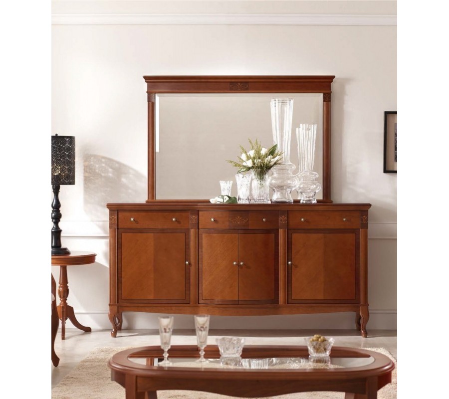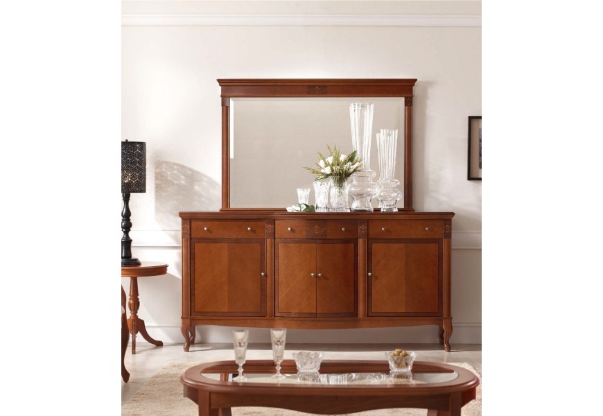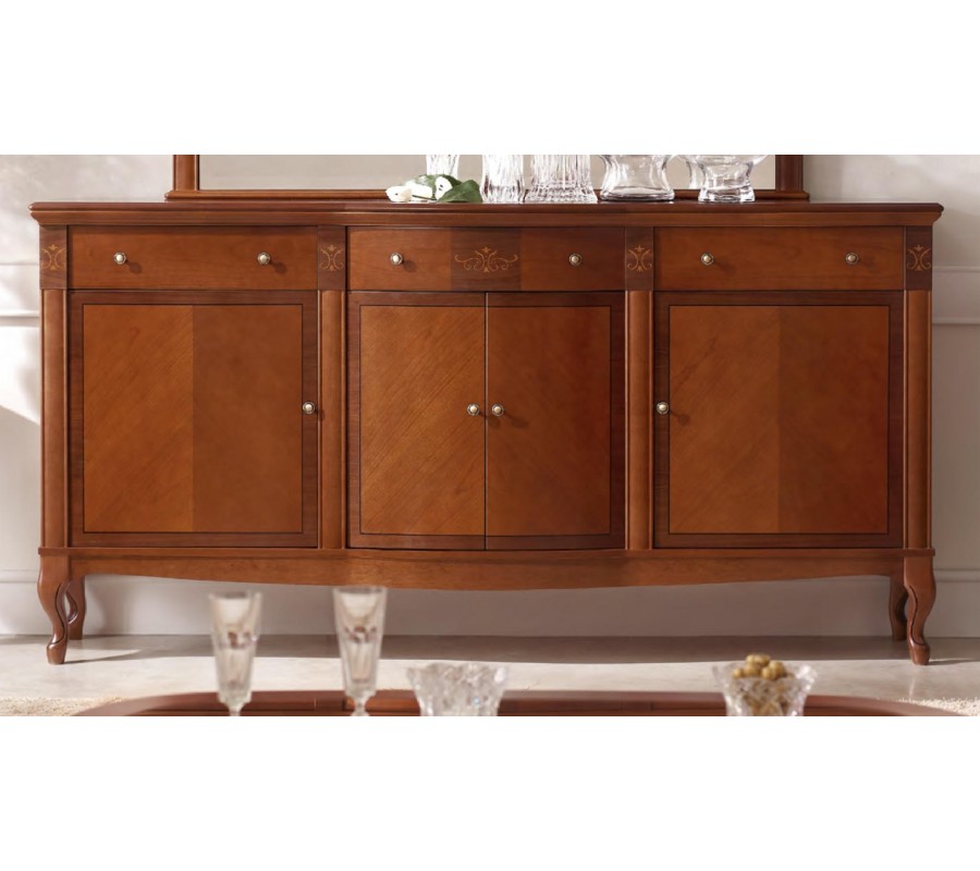 Exkluzívny príborník na nožičkách z kolekcie CASTILLA na prvý pohľad ohromí svojim elegantným, rustikálnym vzhľadom a obrovským množstvom úložného priestoru. Ručne vyrábané ozdobné prvky sú vo variante Čerešňa a Orech zhotovené vkladaním drobných častí z dreva odlišného odtieňa do povrchu (tzv. technikou marketérie). Celý príborník je zhotovený z kvalitného masívu bukového dreva, a doplnený o ochrannú vrstvu kvalitnej drevenej dyhy. Rovnako ako všetok nábytok kolekcie CASTILLA, je možné aj tento kúsok vyhotoviť v štyroch farebných prevedeniach.