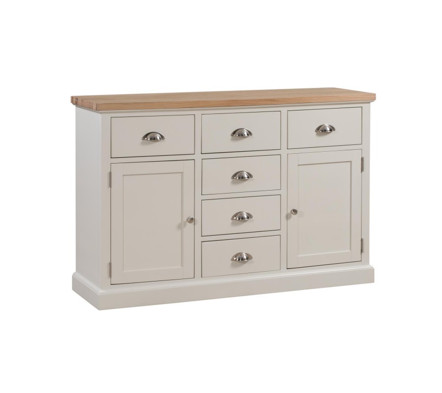 Dizajnový príborník z kolekcie nábytku Valence v sebe šikovne prepája vidiecke a moedrné prvky. Okrem príjemného dizajnu vo vkusnej farebnej kombinácii príborník poskytuje množstvo praktického úložného priestoru v podobe šiestich zásuviek a dvoch skriniek s dvierkami. Príborník Valence je skutočne variabilným kúskom nábytku, ktorý si svoje miesto môže nájsť napríklad aj v predsieni či v spálni ako klasická komoda. V prípade, že by ste mali záujem o tmavšiu farebnú kombináciu odporúčame Vám sa pozrieť na našu kolekciu Montana.