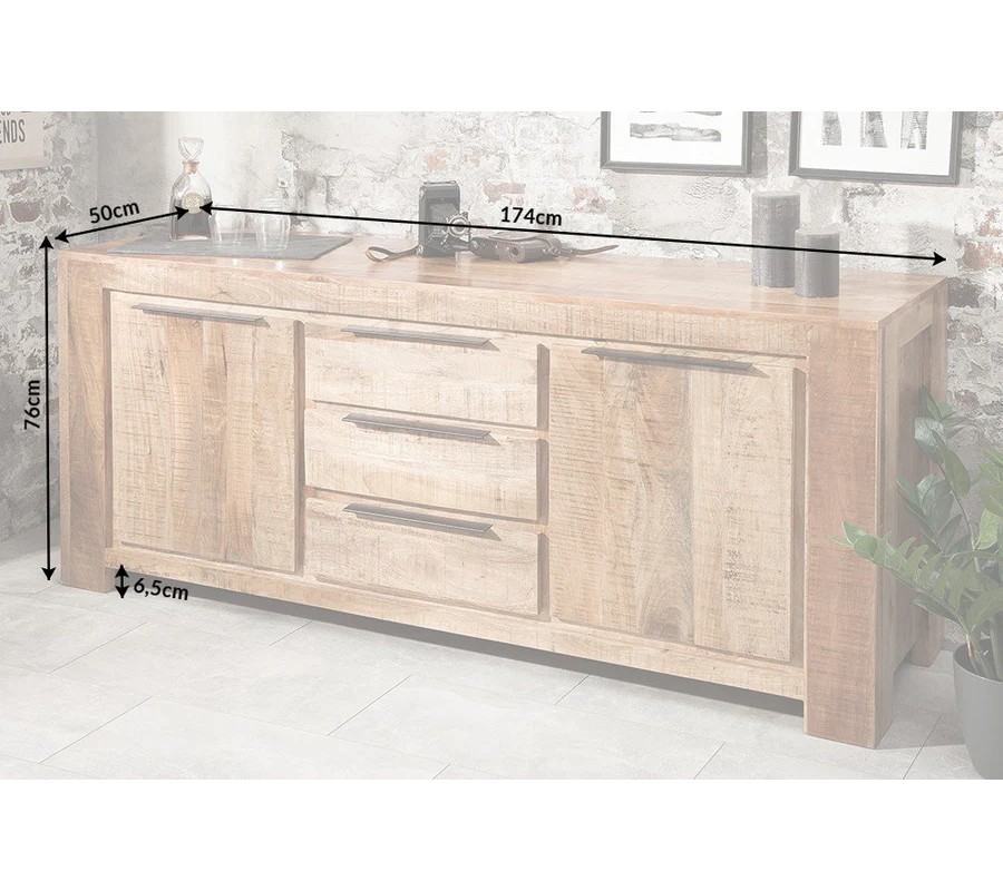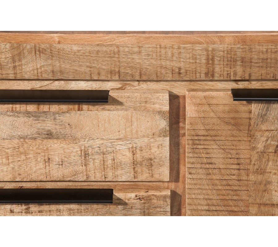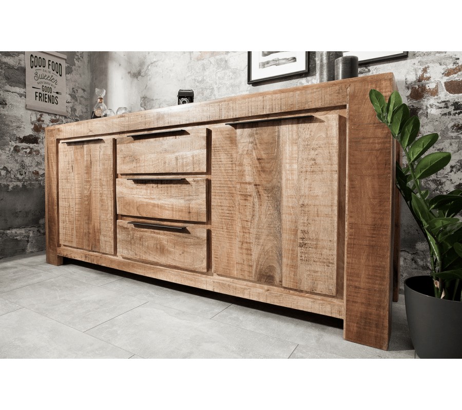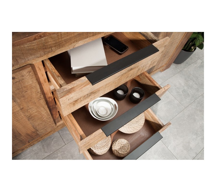 Príborník Steele Craft na prvý pohľad zaujme svojím moderným dizajnom a luxusne pôsobiacim vzhľadom masívneho mangového dreva. Povrch nábytku si zachováva prirodzenú kresbu dreva, čím vytvára teplý a autentický dojem. Vďaka precíznemu opracovaniu pôsobí robustne, no zároveň elegantne.