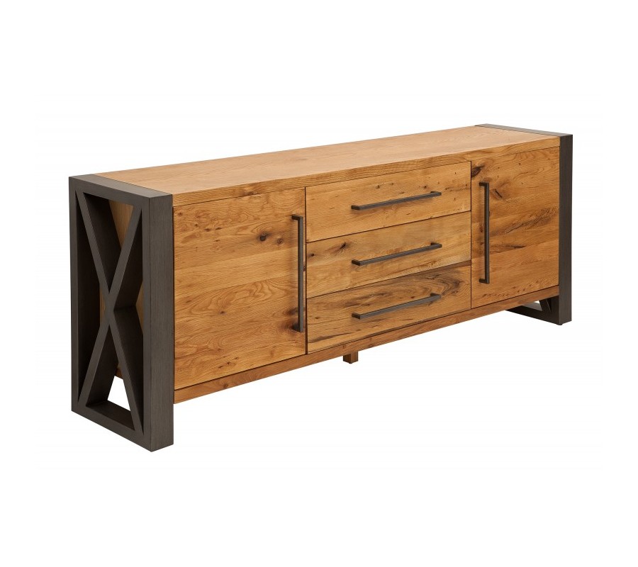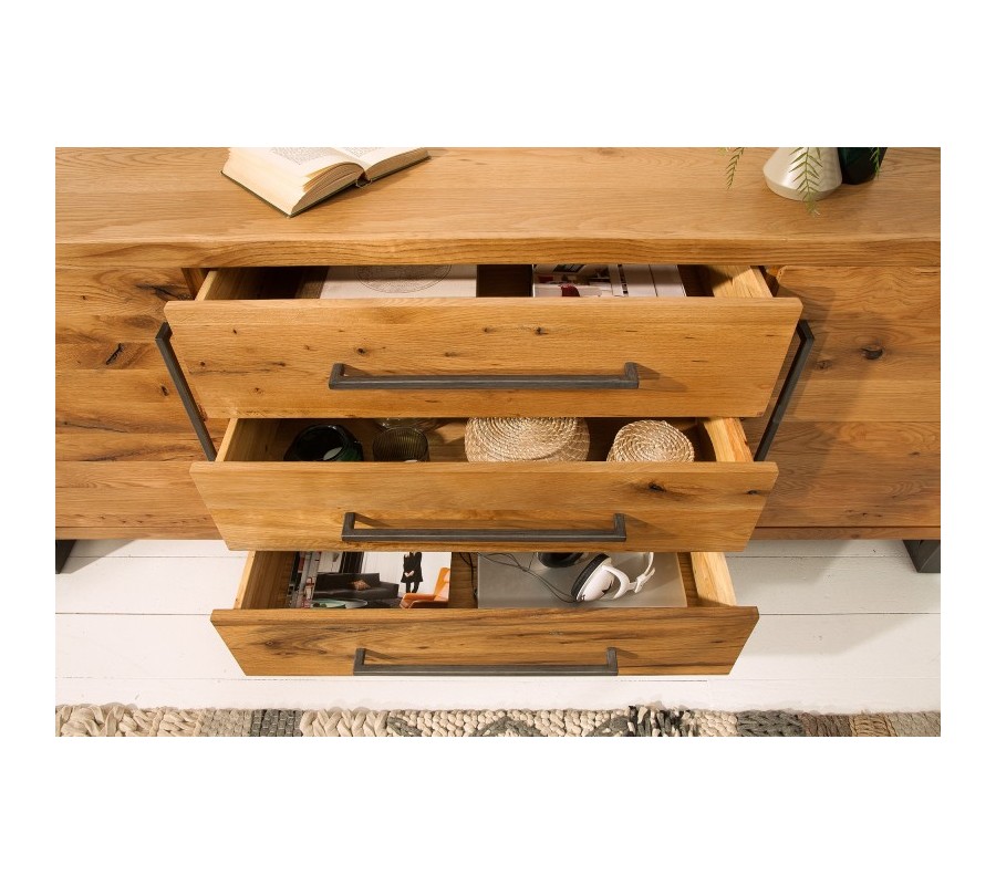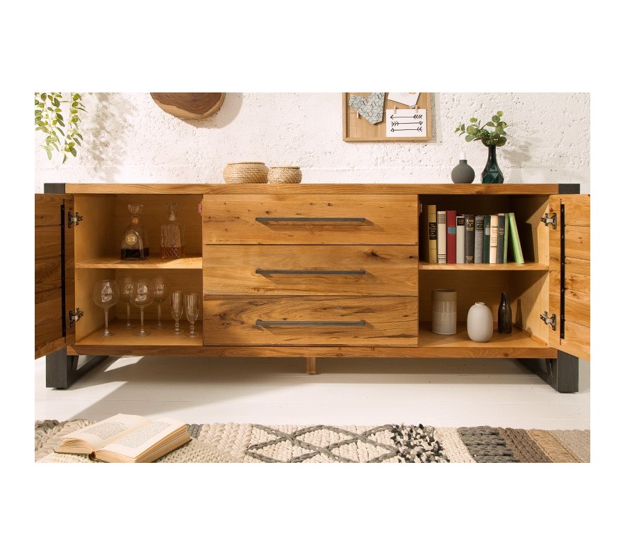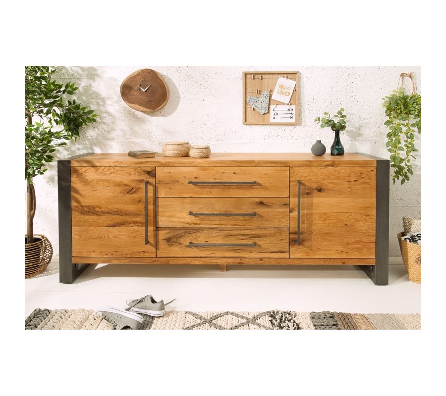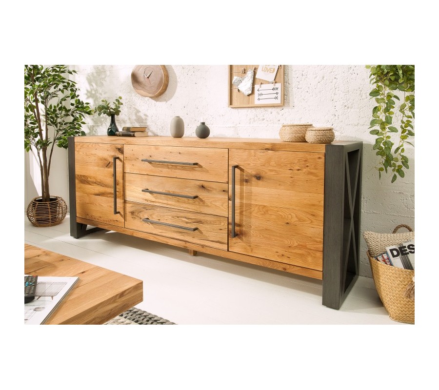 Štýlový príborník Adin je skutočne dizajnovým kúskom, ktorý sa nesie v industriálnom štýle. Je vyrobený z kvalitného masívneho dreva z divokého dubu v svetlohnedej farbe, na ktorého povrchu je možno vidieť zaujímavú kresbu. Vďaka tomu dostáva príborník Adin naturálny nádych. Disponuje tromi zásuvkami a štyrmi poličkami s dvierkami, ktoré poskytujú dostatočný úložný priestor, či už tento kúsok využijete v jedálni alebo v obývačke. Zaujímavým dizajnovým prvkom je rám z kovu čiernej farby a rukoväte, ktoré kontrastujú so svetlým, prírodným dreveným materiálom, a vytvárajú tak skutočne ojedinelú a zaujímavú kombináciu. Skvelo vynikne v svetlých i tmavších priestoroch.