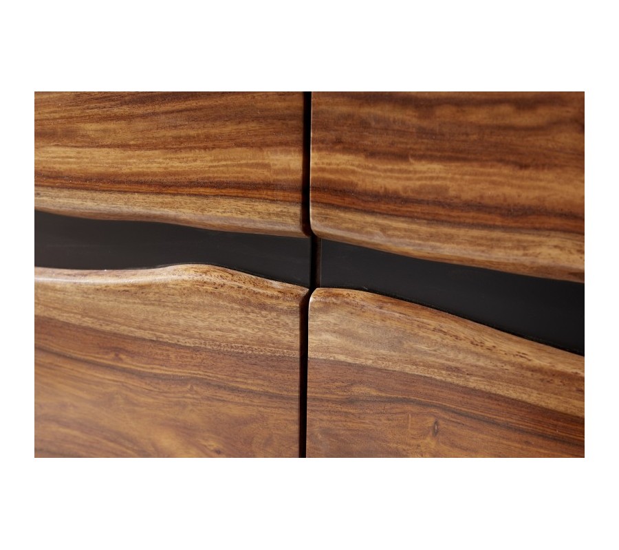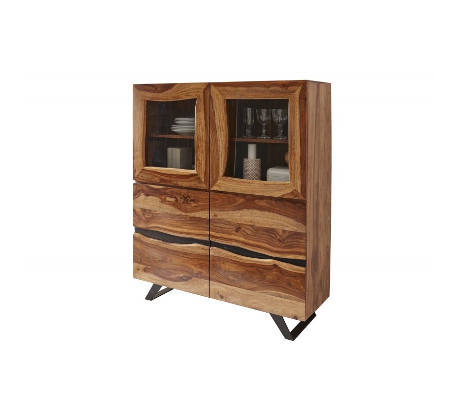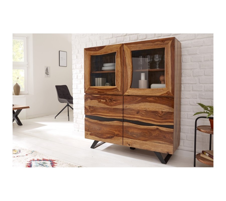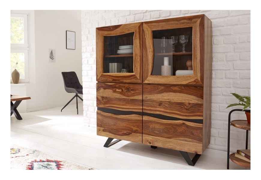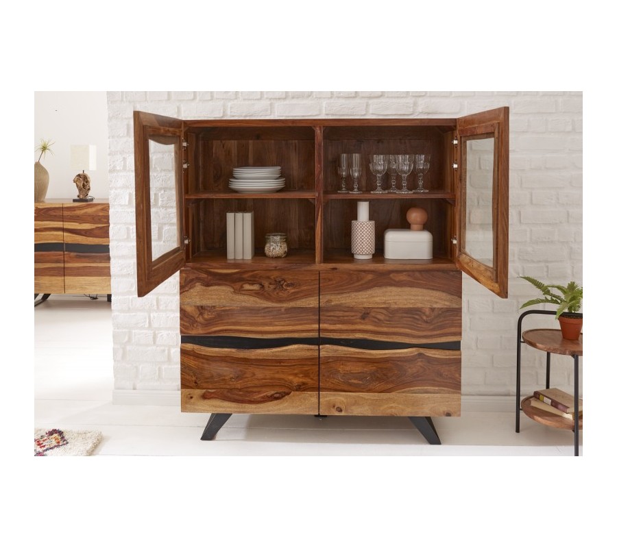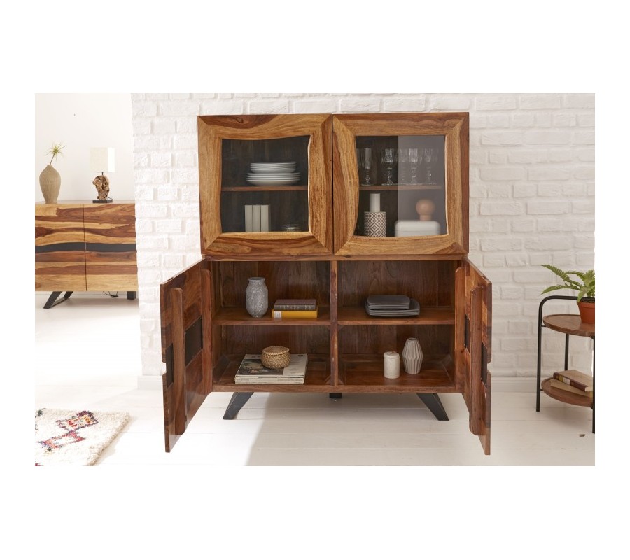 Štýlová vitrína Sheesham je kúskom vhodným najmä do obývacích miestností alebo jedální ladených v modernom či industriálnom štýle. Industriálny nádych získava vďaka kombinácii masívneho dreva a kovových nožičiek. Farbená kombinácia hnedého dreva a čierneho kovu je taktiež zaujímavá a bude dominovať najmä v svetlejšie ladených priestoroch. Vitrína disponuje ôsmymi praktickými poličkami, pričom v spodnej časti sa nachádzajú celodrevené dvierka s kovovým prvkom a v hornej dvierka presklené, a teda ideálne na vystavenie rôznych dekorácii či štýlových keramických setov. Vitrína Sheesham vynikne najmä v kombinácii s ďalšími masívnymi kúskami, odporúčame taktiež kombináciu s produktmi z našej rovnomennej kolekcie.